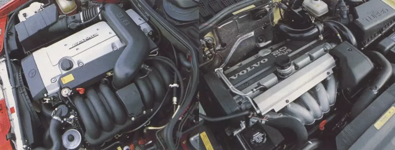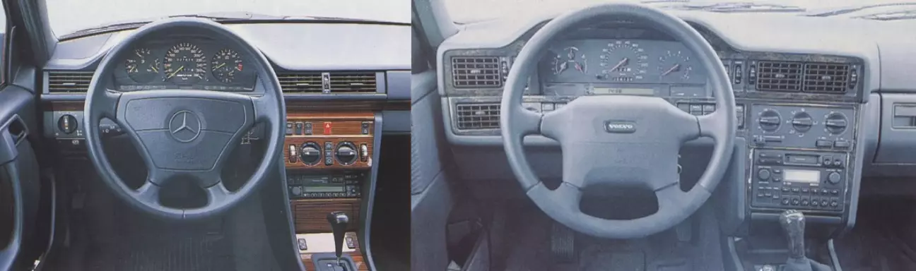 Впереди водителя Volvo окружает атмосфера надежного автомобиля, который демонстрирует смелость в угловатом, самобытном дизайне и не оставляет особых загадок в управлении. Даже изначально непривычные детали, такие как внутренние ручки дверей, после короткого привыкания оказываются разумно-приятным решением. Только элемент управления дисплеем бортового компьютера должен находиться ближе к рулевому колесу. Mercedes не предлагает такого прибора, включая индикатор расхода. Однако Mercedes E 36 гораздо острее нуждается в какой-либо форме спортивного оформления в салоне. Только тахометр, размеченный до 280 км/ч, с надписью AMG является визуальным подтверждением дорогостоящего обновления стоимостью около 30 000 марок — все остальное соответствует серийному стандарту.