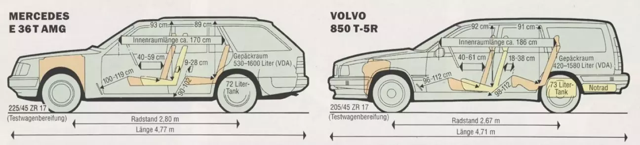 Здесь будет речь идти о настоящем соотношении тяга/мощность, о двух спорткарах, идеально замаскированных под универсалы. Или, может быть, даже наоборот: о двух взбесившихся грузовиках? В конце концов, этот Mercedes (цена 115 747 DM) и эта Volvo (цена 81 750 DM) несут в себе не только концентрированную практичность, но и определенную склонность к гоночной трассе: уверенно преодолеть Хоккенхаймринг с 1,6 куб. метрами грузового пространства — для обеих это легкое упражнение.