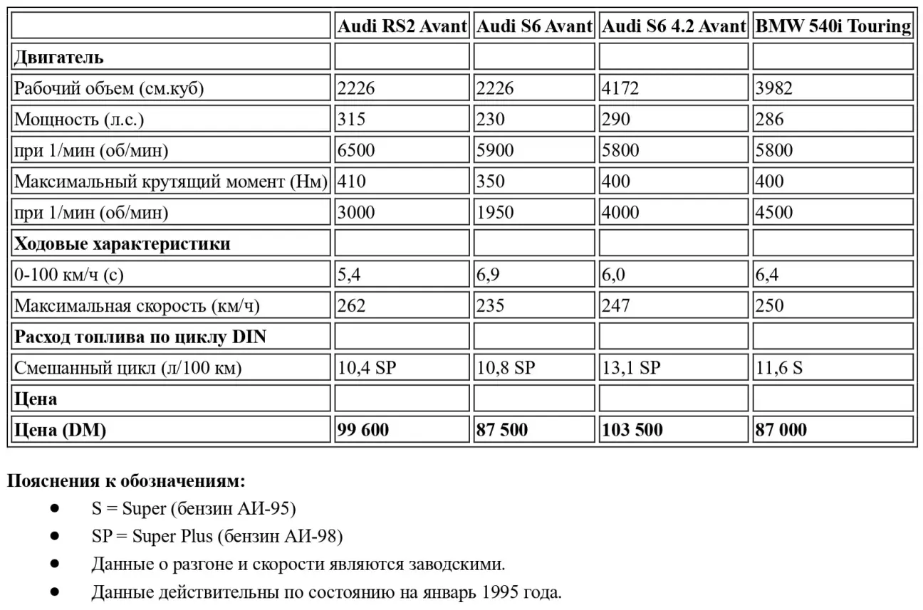 Характеристика мощности выглядит более сбалансированной в более просторном Audi S6 Avant: 230 турбо-лошадиных сил развиваются очень равномерно. Ходовые качества близки к Volvo T-5R, цена при схожем оснащении примерно на 20 000 марок выше, а тягу обеспечивает полный привод. Возможно и увеличение мощности: S6 4.2 оснащен очень тяговитым восьмицилиндровым двигателем, который превосходно согласуется с автоматической коробкой передач. Однако цена этого автомобиля почти сопоставима с AMG-Mercedes. К сожалению, Audi S6 Turbo не был доступен для сравнительного теста с Volvo.