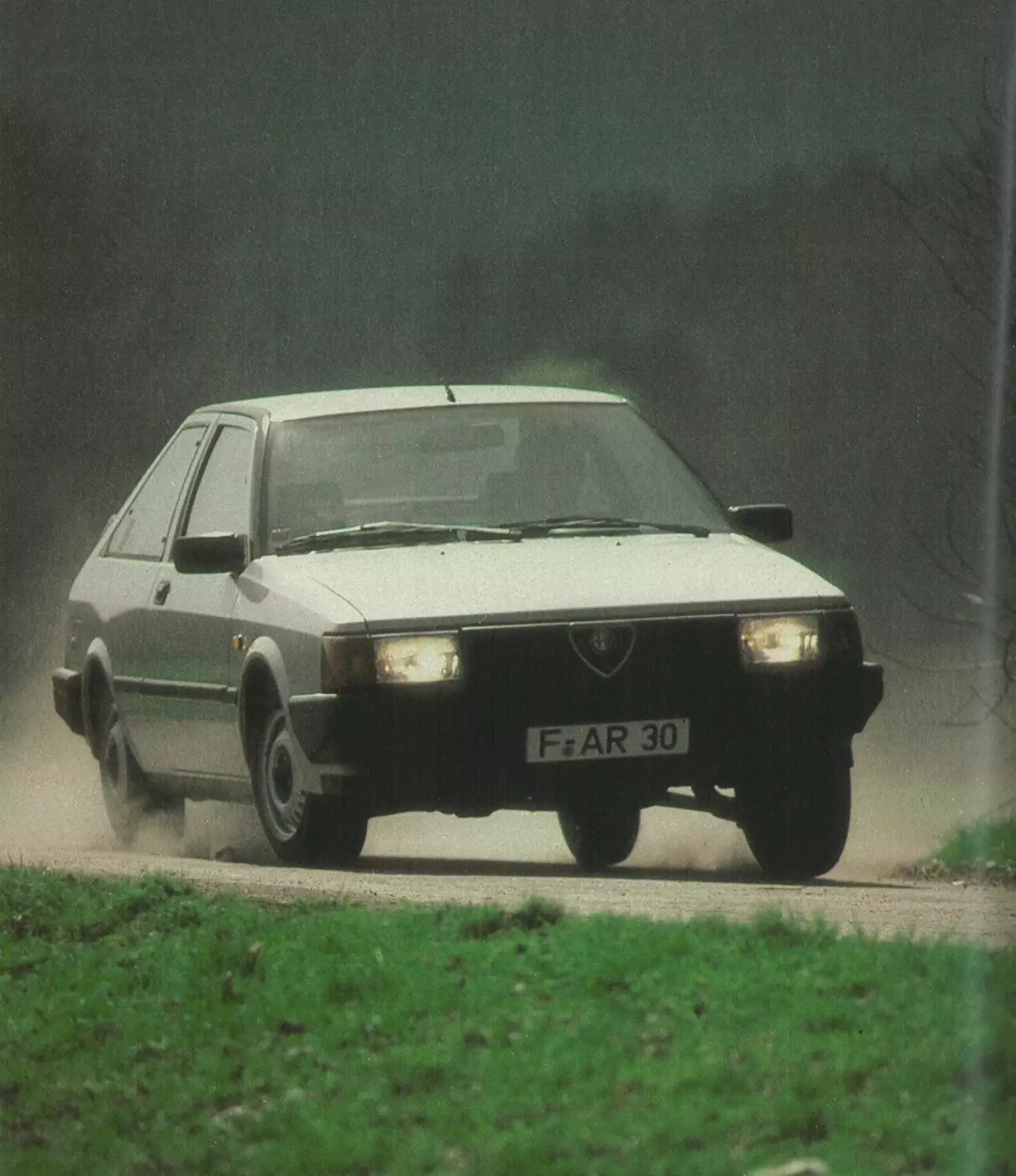 В салоне, напротив, не хватает мест для хранения мелких предметов. Кроме того, следует отметить, что неудобство в управлении, известное по Alfasud, изменилось незначительно. Как и прежде, звуковой сигнал, например, включается тем же рычагом справа от рулевой колонки, которым включаются и выключаются стеклоочистители. Замок зажигания также по-прежнему расположен слева от рулевой колонки. Непрактичной также можно считать систему с двумя ключами, и в ходе исследования не удалось выяснить, является ли это следствием партнерства между двумя автомобильными компаниями. К посадке за рулем, который регулируется по высоте, претензий нет. Зелено-черные передние сиденья имеют достаточную регулировку и, таким образом, хорошо подходят для водителей разного роста. Кроме того, благодаря ярко выраженной боковой поддержке в области сиденья и спинки, они обеспечивают хорошую фиксацию при быстром прохождении поворотов.