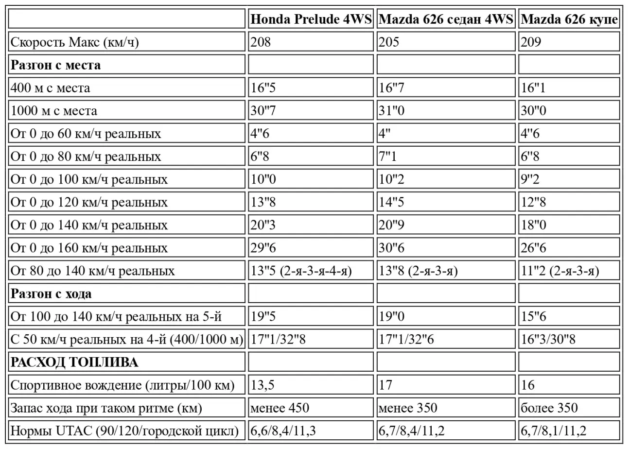 С точки зрения соотношения веса и мощности, это выражается в 7,8 кг/л.с. для купе Prelude, что является таким же показателем, как и у купе Mazda 626, и оба они, таким образом, находятся на ступень ниже Toyota Celica (7,6 кг/л.с.). Мы отмечаем в связи с этим, что купе Honda не слишком страдает от избыточного веса, вызванного его системой 4WS (+15 кг), поскольку в конечном итоге оно не тяжелее двух своих соперников. К сожалению, это не относится к седану 626 4WS, который весит 1320 кг в снаряженном состоянии, и чье соотношение веса и мощности возрастает до 8,9 кг/л.с. Система 4WS Mazda утяжеляет седан 626 на 65 кг! В этом случае нашей красавице-японке будет трудно тягаться с BX 16 soupapes (клапанов) или 405 Mi 16, которые, тем не менее, являются двумя ее самыми серьезными соперниками на французском рынке. Теперь мы проверим, как эти чисто теоретические данные отразились на наших традиционных замерах.