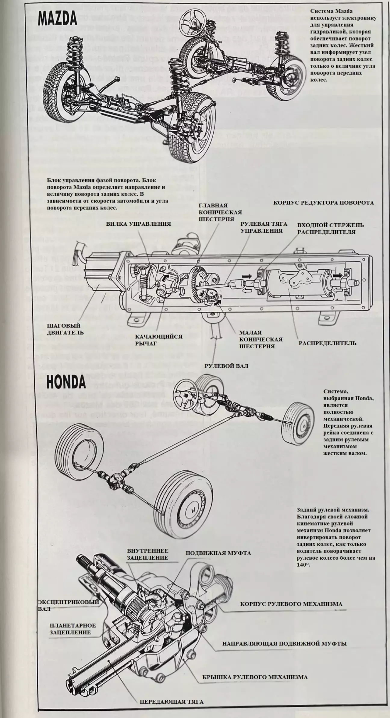 Когда они перешли к этапу реализации, Honda и Mazda, напротив, выбрали разные решения. Honda выбрала чисто механическое устройство. Передняя рулевая рейка соединена жестким валом с рулевым механизмом, расположенным сзади. Именно на нем основана вся оригинальность системы. Благодаря своей кинематике он меняет направление поворота задних колес в зависимости от угла поворота передних колес. Пока угол поворота руля не превышает 140°, задние колеса ориентированы в том же направлении, что и передние (максимум 1,7°). При превышении этого угла они поворачиваются в противоположном направлении (максимум 5°). По сравнению с купе Prelude, оснащенным классическим рулевым управлением, радиус поворота уменьшается на 1 метр. Prelude выигрывает от прогрессивного усилителя рулевого управления, который меняется в зависимости от скорости: очень сильный на низкой скорости и острый, поскольку требуется всего 2,5 оборота руля, чтобы перейти от упора до упора.