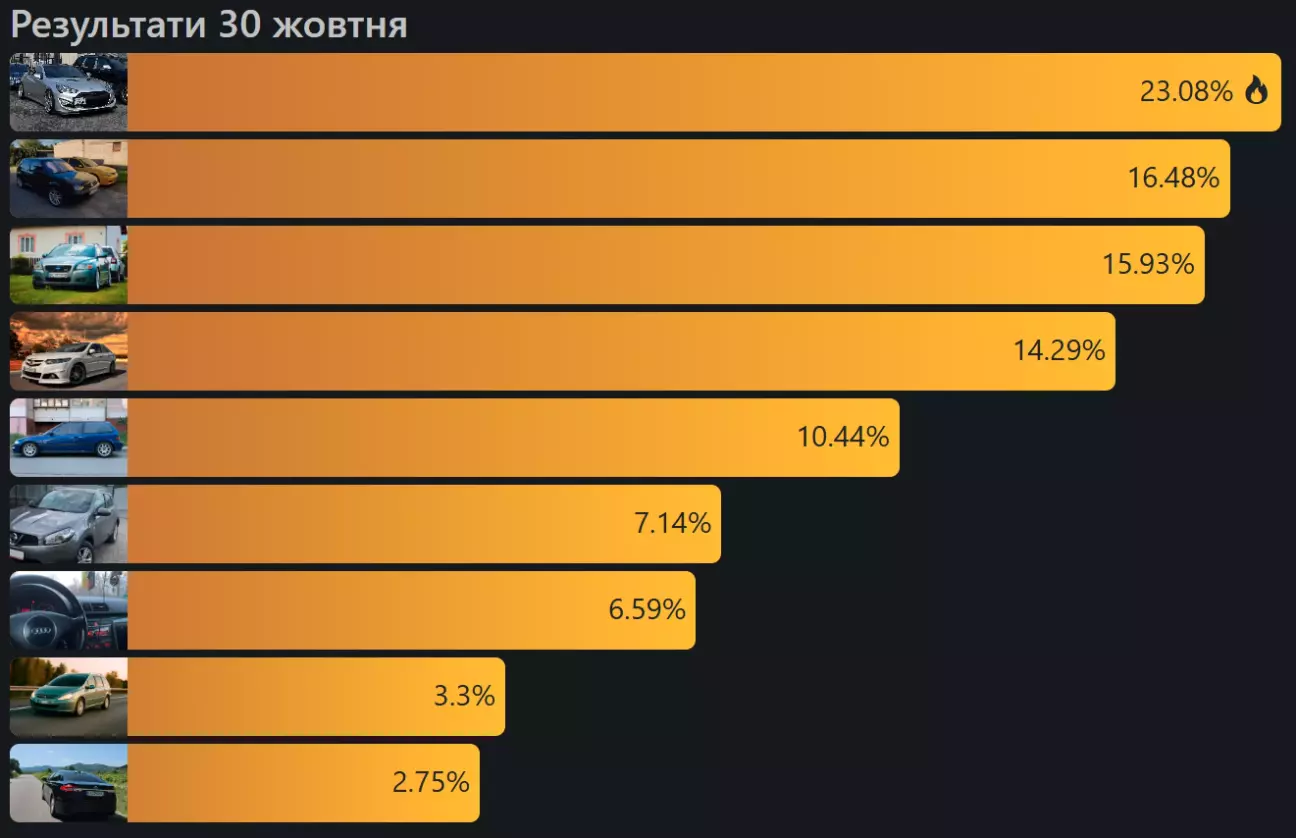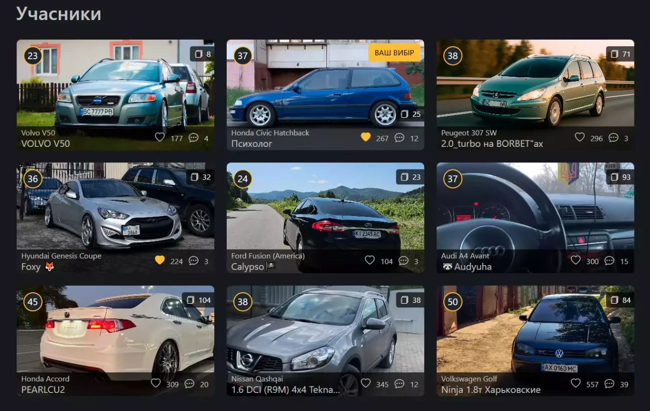Моє авто набрало 23.08%. Математичні розрахунки кажуть що загалом в голосування прийняло участь 210-230 людей (враховуючи бонусні голоси), негусто...