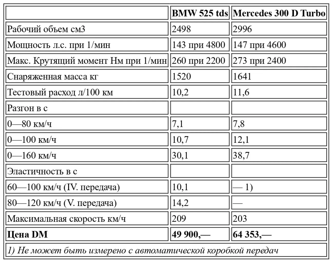 Ещё одно решающее различие между двумя шестицилиндровыми дизелями: BMW удалось, несмотря на дизельный двигатель, предложить настоящую BMW — с силовым агрегатом, который для дизельных стандартов отличается особой резвостью, хорошей отзывчивостью на газ и готовностью к высоким оборотам, который в активном в управлении BMW пятой серии не выглядит неуместным ни на одной фазе работы. У Mercedes характер двигателя и облик автомобиля также хорошо сочетаются, хотя и совершенно другим образом. Несмотря на высокие ходовые характеристики для дизельных стандартов, здесь получилась полная противоположность спортивного седана. Mercedes 300 D Turbo менее спонтанен не только в развитии мощности, но и в управлении. Он представляет собой прототип качественно сделанного автомобиля для длинных дистанций, в котором экономишь не только топливо, но и прежде всего нервы. Тот факт, что он предлагает лучший комфорт подвески и меньший шум от ветра по сравнению с BMW, вносит решающий вклад в это. Но его потенциальным владельцам тоже не избежать небольшого выброса адреналина. Он стоит гордые 64 353 марки в прейскуранте Mercedes и таким образом превышает цену BMW почти на 15 000 марок. Такое четкое пособие по принятию решений хотелось бы видеть почаще.