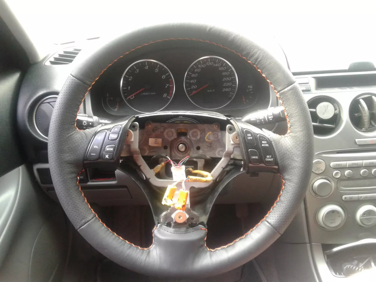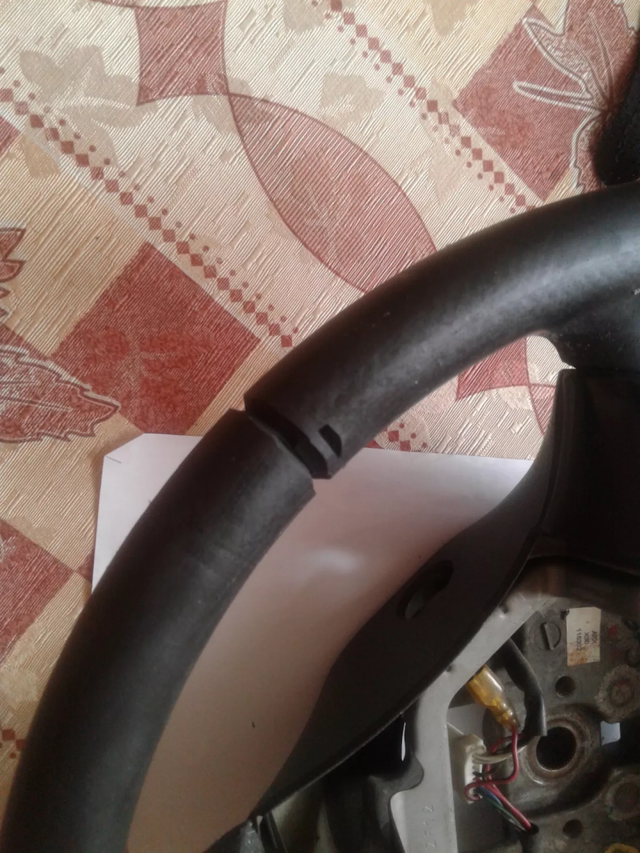 Вот и дошли руки к оплетке руля. Дабы не было видно швов, немного "доработал" руль. А именно, канцелярским ножом прорезал 4 поперечных прорези.