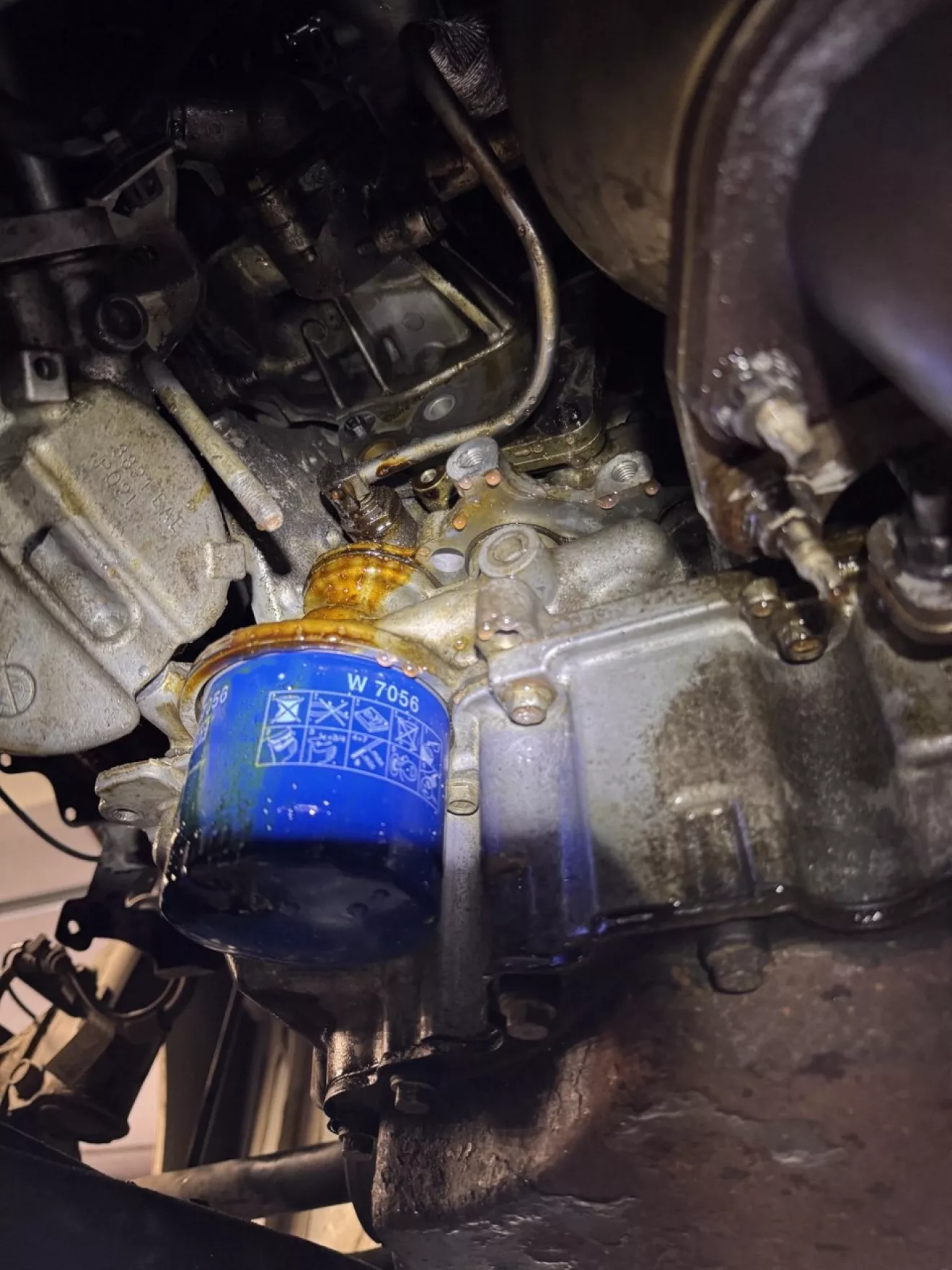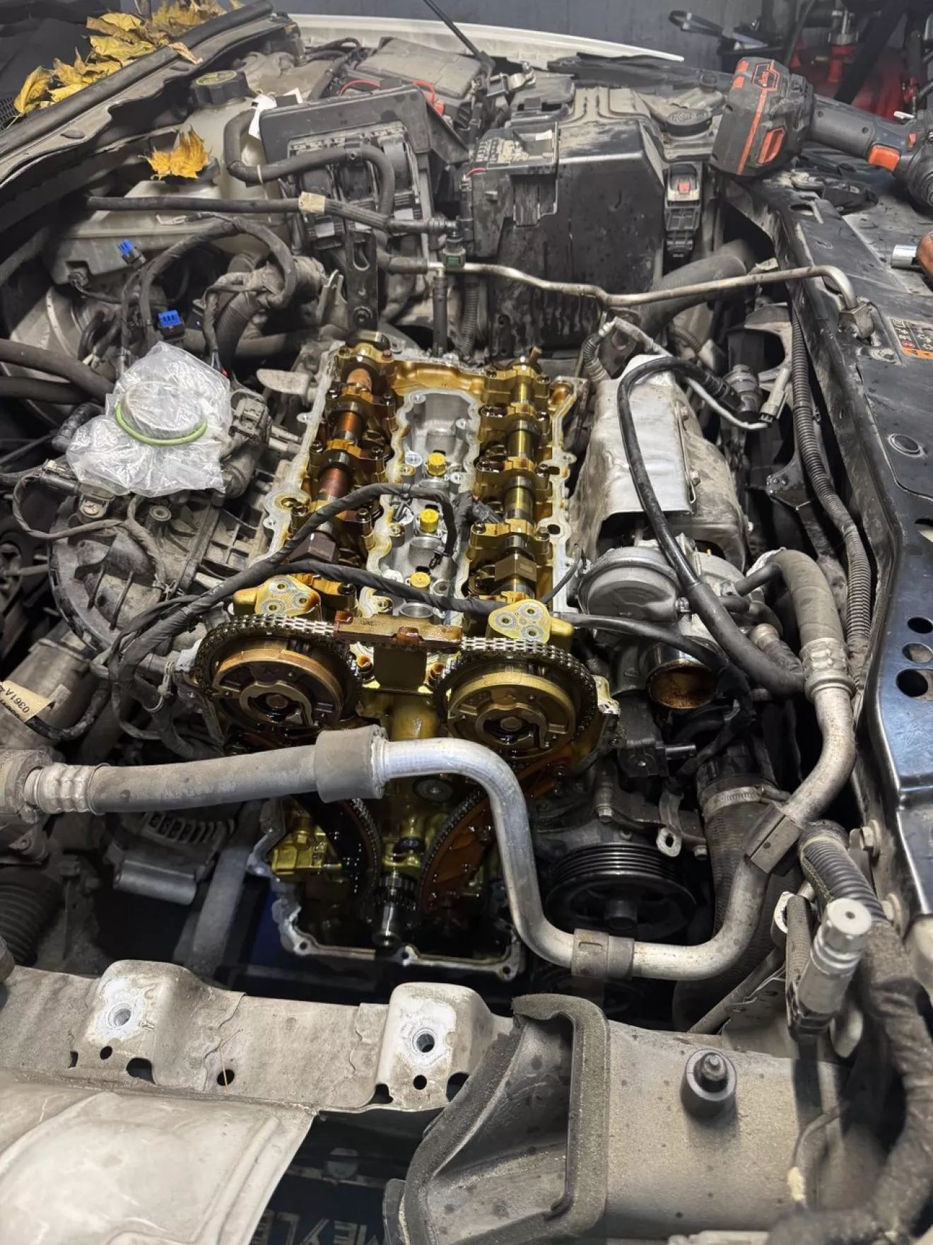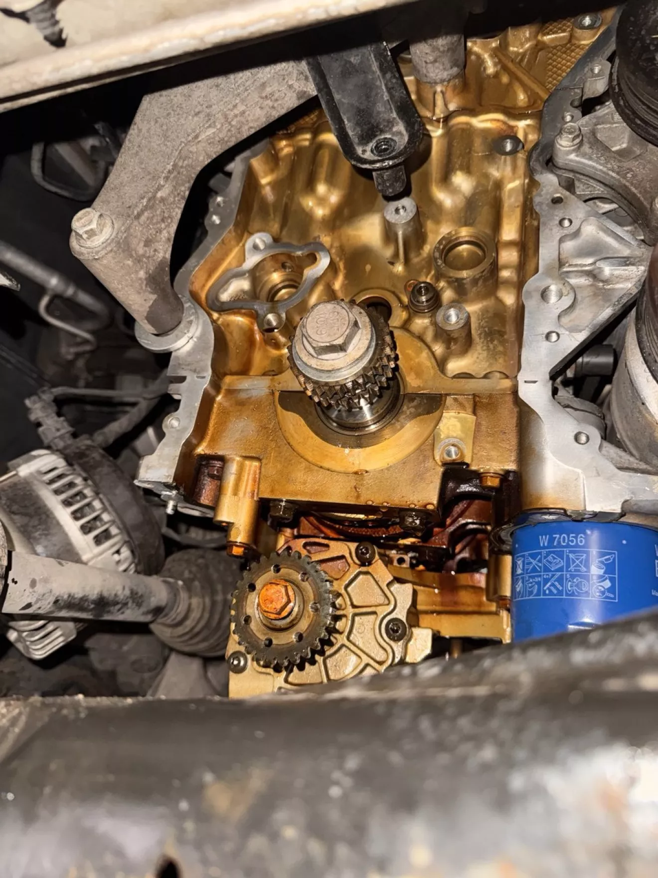 оказалось что хоть что то да в этом авто отлично. цепь перед нами сделано все очень просто все по меточкам бери да меняй. снимаем башмаки, снимаем цепь, снимаем фазики и доходим до самого интересного. до звезды коленвала и для того чтобы ее снять, нужно снять цепь с масленого насоса, все мы знаем такие же прекрасные двигатели концерна ваг семейства EA888, отодвигаем натяжитель и снимаем цель масленого насоса. но увы и ах. здесь кто-то зажал пол звена и данная опция нам не доступна. по этому делаем широкую улыбку ставим назад кронштейн двигателя