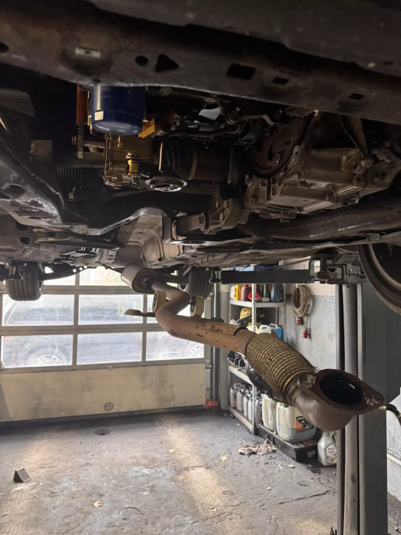 и снимаем поддон, предварительно открутив приемную трубу от катализатора.