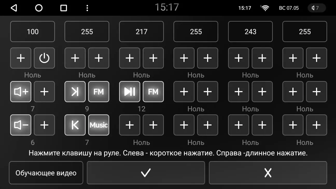 Натиснути на кнопку [+]: ліворуч - по короткому натисканню, праворуч - по довгому (утриманні кнопки), натиснути і утримувати потрібну кнопку на кермі, вибрати дію, відпустити кнопку на кермі. І так із усіма кнопками.