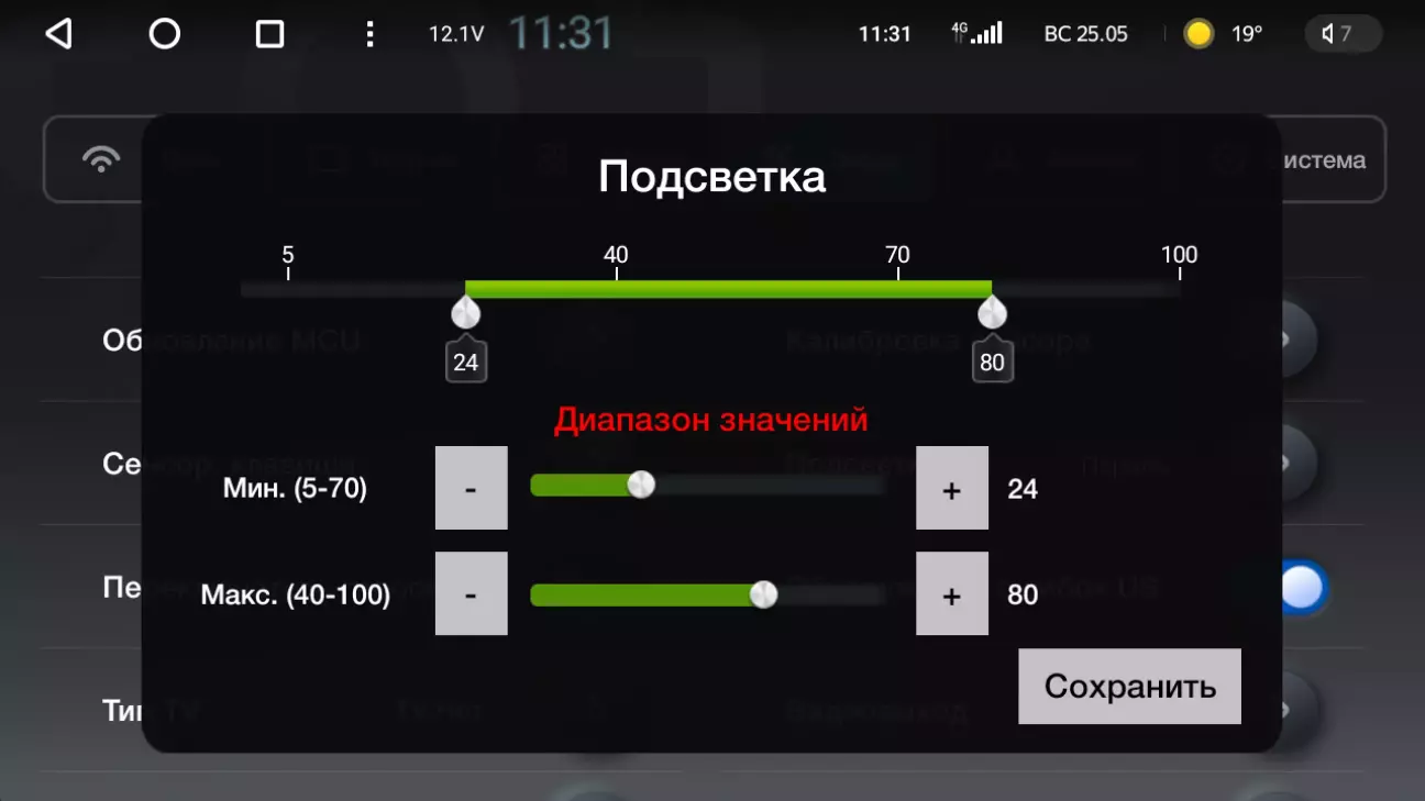 Налаштування - "Завод" - 168 - "Підсвічування" - ввести в поле 168, значення "Мін." знизити до 22-24 (замість 28, робиться один раз) та натиснути "Зберегти".