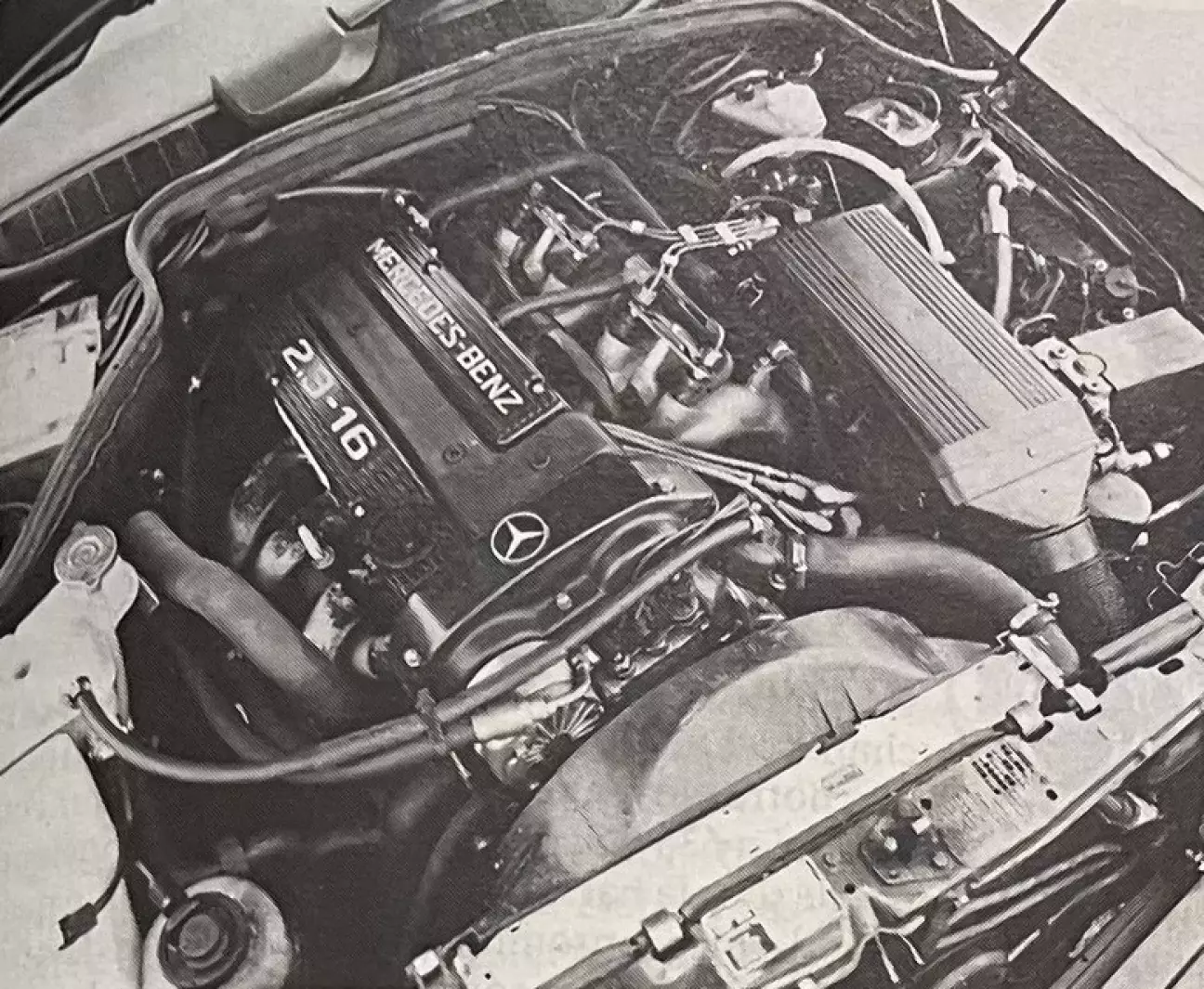 Двигатель Mercedes 190 2.3-16 — это спортивная эволюция уже известного 4-цилиндрового мотора от 230E. В нем используется чугунный блок, где коленчатый вал вращается на 5 опорах. Головка блока цилиндров — английская разработка за подписью Cosworth. Она отличается двойным рядом клапанов, наклоненных друг к другу на 45 градусов. Каждый цилиндр имеет 2 впускных и 2 выпускных клапана с одновременным открытием. Эта технология позволяет увеличить площадь сечения каналов, способствуя лучшему наполнению и очистке цилиндров. Другое преимущество — снижение движущихся масс, поскольку клапаны меньшего размера; это задерживает появление паразитных движений. Эти два ряда клапанов управляются двумя верхними распредвалами, приводимыми в движение не зубчатым ремнем, как обычно, а устаревшей цепью, считающейся более надежной. Двигатель питается электронно-механическим впрыском Bosch KE-Jetronic, системой, уже используемой на 190E и 230E. Напомним, что эта технология использует механически выполненную базовую настройку, которая уточняется электронно; это объясняет, почему двигатель может работать даже при возможном отказе электроники, конечно, с меньшей точностью, что позволяет без проблем добраться до ближайшего сервиса. Выхлопная система также была доработана Cosworth, с великолепным трубчатым коллектором «спагетти» (это выражение оправдано и в автомобильной механике), тщательно настроенным. Этот трубчатый коллектор, очевидно, занимает много места, чтобы обеспечить одинаковую длину для каждого цилиндра для оптимальной отдачи.