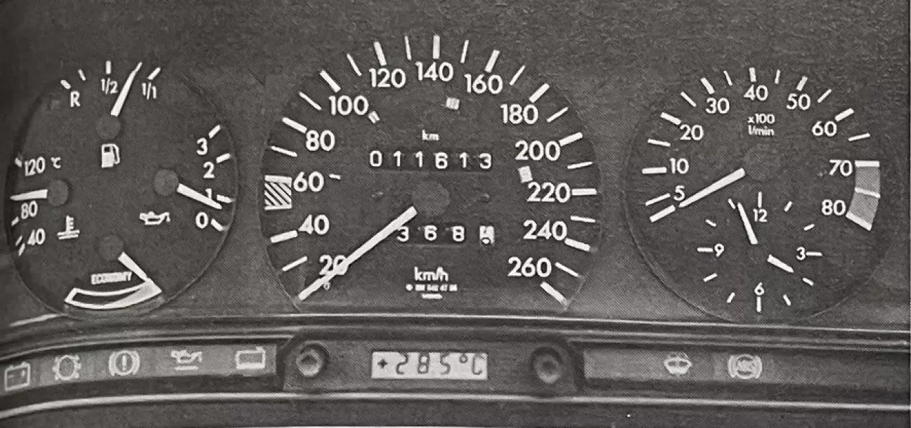 Нет специального оборудования для этой спортивной версии! Правда, другие 190, как и большинство Mercedes, имеют богатую приборную панель. Здесь есть большой спидометр, счетчик оборотов, аналоговые часы, группа из 4 приборов, собранных в один круг: указатель уровня топлива, термометр охлаждающей жидкости, манометр масла и эконометр (удивительное внимание в таком автомобиле). Все это подчеркнуто линией очень хорошо читаемых индикаторов и — опционально — дополняется внешним термометром. Три других прибора расположены в основании центральной консоли: термометр смазочного масла, вольтметр и хронометр (фантазийный на нашем автомобиле). Эти три прибора не читаются во время вождения.