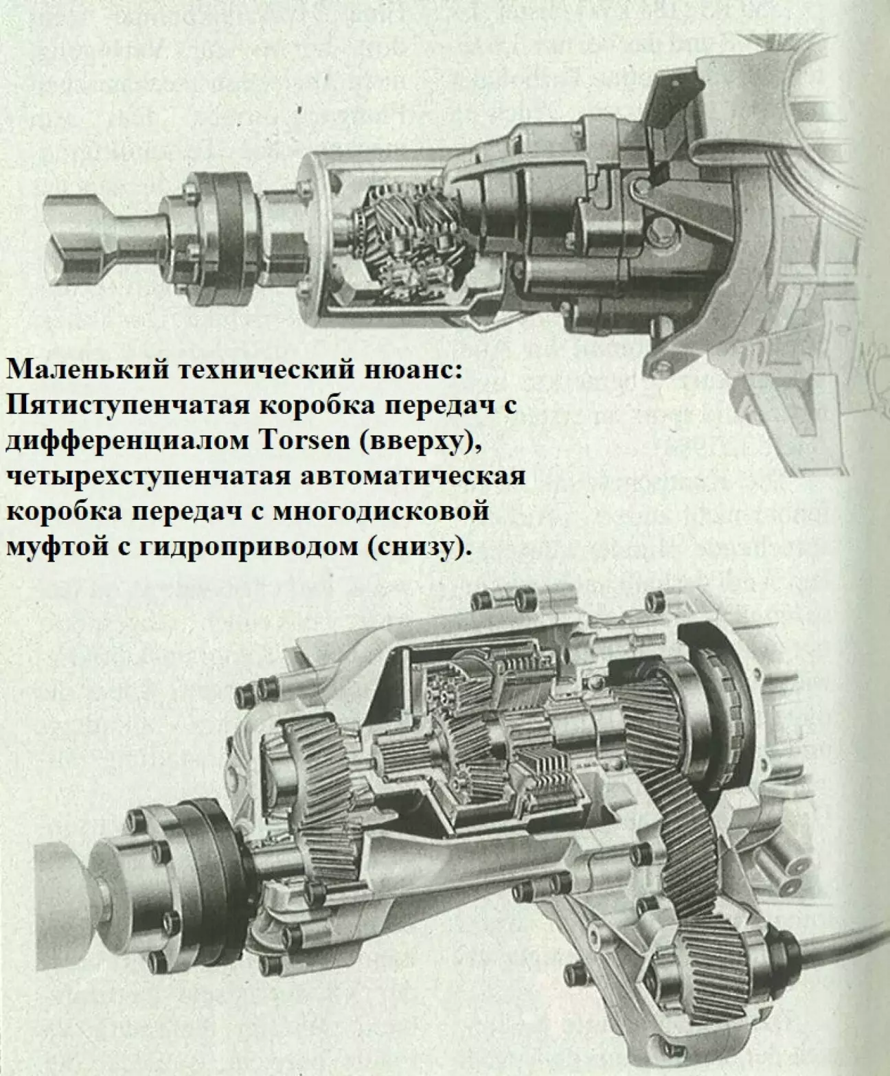 Новый вариант использует технику от Audi 200 Quattro. Оттуда взята коробка передач, хотя и усиленная в соответствии с более высоким крутящим моментом, а также межосевой дифференциал в трансмиссии полного привода. Тяга теперь передается по замысловатым путям самоблокирующегося дифференциала Torsen, в то время как автоматическая модель по-прежнему использует комбинацию планетарного дифференциала и многодисковой муфты с гидравлическим управлением. Причина: муфта может быть подключена к гидравлической системе управления автоматической коробкой передач. Там уже имеется гидравлический насос, чего нет в механической пятиступенчатой коробке. Поэтому чисто механический дифференциал Torsen является здесь наиболее очевидным, поскольку это более экономичное решение. Вот и весь небольшой технический нюанс.