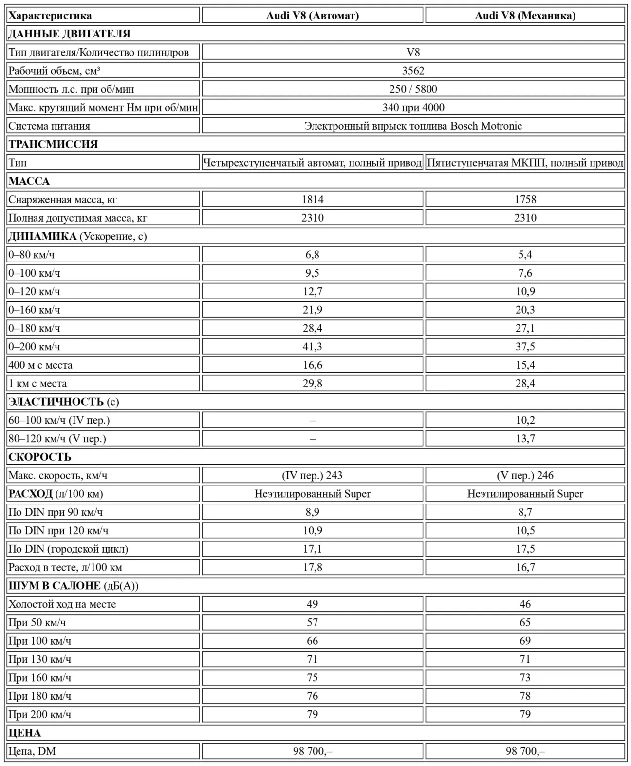 Она этого, в общем-то, не заслужила. Этому великолепному мотору V8 приходится работать в заурядном седане, который только знаток сможет отличить от обыкновенной Audi 100. Нагруженная техникой и обильно оснащенная, Audi V8 весит целых 1,8 тонны снаряженной массы. И как будто этой ноши было недостаточно, ей приходится мириться еще и с энергозатратной автоматической коробкой передач, которая невыгодно маскирует ее блестящие мощностные характеристики. Audi V8 развивает 250 л.с., и это при рабочем объеме всего 3,6 литра, без турбонагнетателя и с катализатором. По крутящему моменту этот четырехклапанный V8 также лидирует в своем объеме: 340 Нм при 4000 об/мин. Однако в версии с автоматом до сих пор это было малозаметно. Уверенности в превосходстве Audi V8 недостает, — отметил auto motor und sport в первом тесте (выпуск 22/1988). По-видимому, клиентура считала так же. В ответ на соответствующие пожелания клиентов, — добавляет Audi то, что изначально вообще не планировалось. Тот, кто хочет почувствовать V8, может в будущем отказаться от автоматической коробки передач и установить механическую пятиступенчатую коробку. Однако он должен распрощаться с надеждой на ценовое преимущество. Пятиступенчатая и автоматическая версии стоят ровно одинаково, не меньше 98 700 марок.