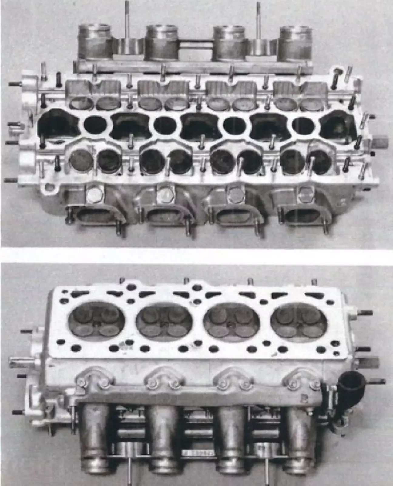Ременные приводы для двух пар распределительных валов содержат по одному натяжному ролику, регулируемому вручную. В головках блока из легкого сплава необычно тонкие распределительные валы расположены относительно близко друг к другу в пяти подшипниках скольжения каждый. Это привело, с одной стороны, к узкой головке блока, а с другой — к небольшому углу между клапанами 33,5 градуса для плоской крыши камеры сгорания. Углы потока и особая форма камеры сгорания с узкой зоной сжатия, прерываемой пазами, оказались хорошим компромиссом. Доказательством служит среднее эффективное давление 12,2 бар — на 1 бар больше, чем у двигателя Ferrari.