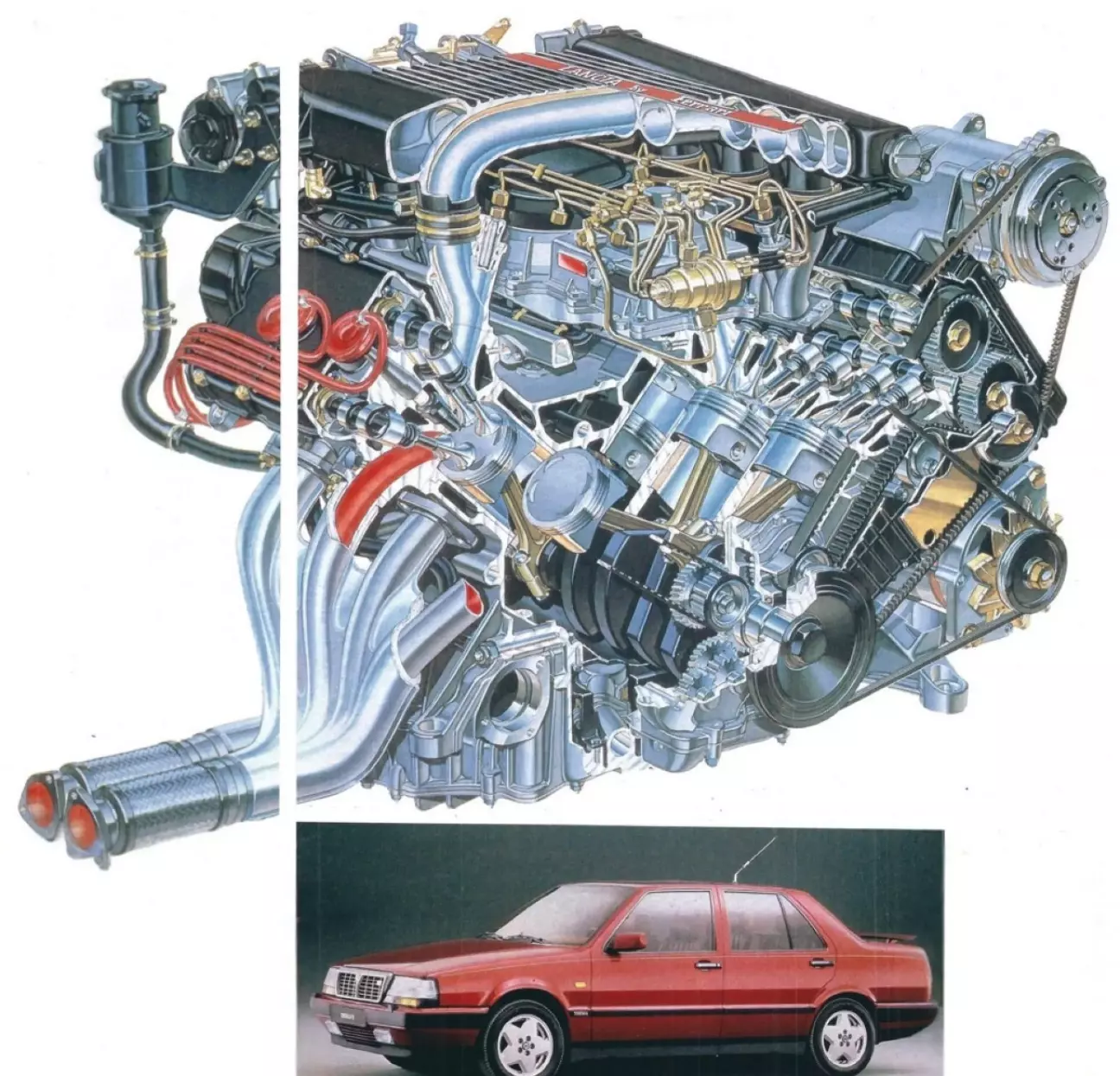 При операции трансплантации, возможно, руководствовались двумя соображениями: лучшее использование производственных мощностей Ferrari и повышение статуса Lancia Thema до уровня настоящей престижной модели — автомобиля, которого ранее не было в программе концерна. При этом завод Ferrari отнюдь не является фабрикой, способной выпекать двигатели, как попкорн. Небольшие объемы производства, однако, обеспечивают эксклюзивность, которая, несомненно, желательна. Компактный восьмицилиндровый мотор Ferrari сконструирован для автомобиля с высоким спортивным имиджем. Соответственно были расставлены и акценты: соотношение хода/диаметра цилиндра со смещением в сторону диаметра, четыре распределительных вала, четыре двухкамерных карбюратора с нисходящим потоком и номинальная частота вращения 7700 об/мин для мощности 255 л.с.