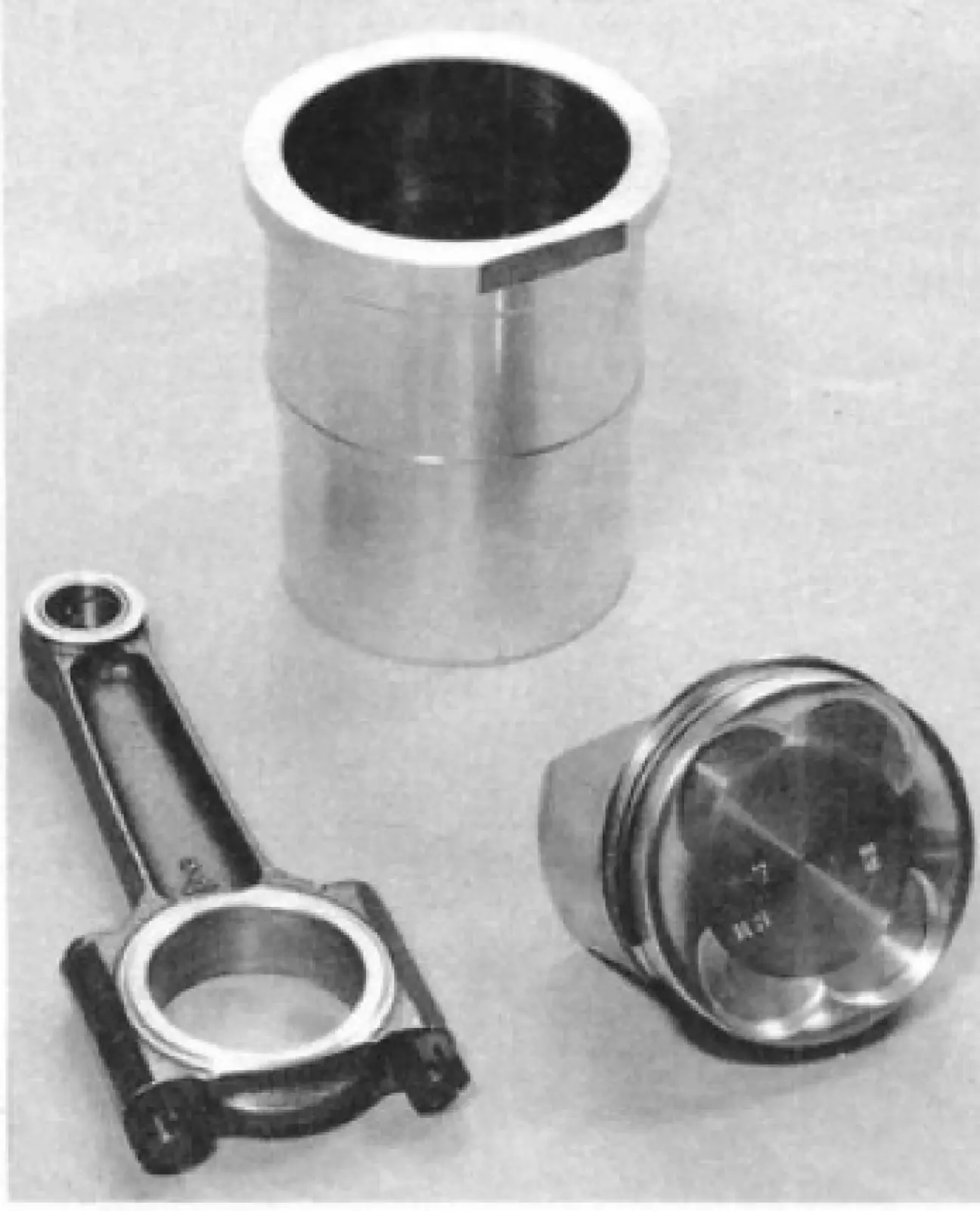 Легкие поршни фирмы Mahle имеют высоту всего 55 мм и несут три кольца: компрессионные кольца необычно узкие — всего 1,0 мм. Верхнее — хромированное прямоугольное кольцо, среднее — трапецеидального сечения, с фаской, нижнее — маслосъемное кольцо с пружиной шлангового типа толщиной 2,9 мм. Днище поршня имеет плоскую выемку с четырьмя пазами по краям для свободного хода клапанов. Поршневой палец диаметром 18,5 мм и длиной 48 мм весит всего 65 граммов. Он имеет плавающую посадку в поршне и в бронзовой втулке в шатуне и фиксируется по бокам стопорными кольцами.