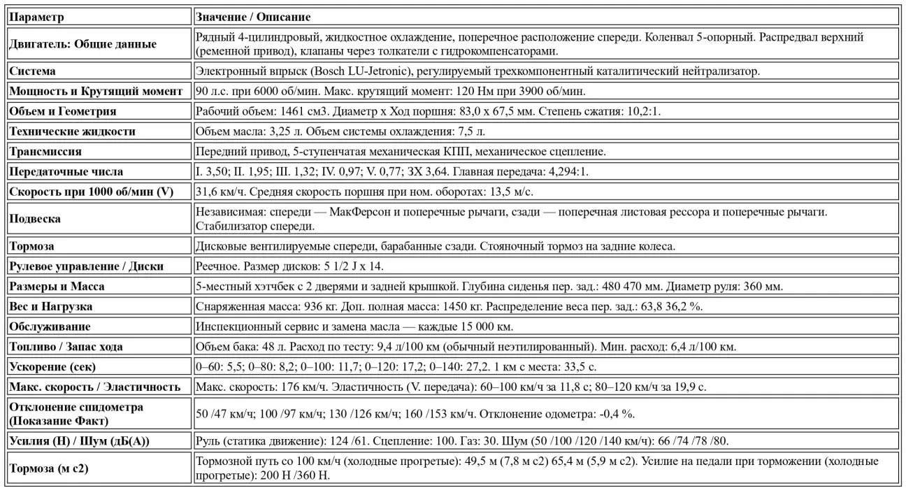 Ibiza с 1,5-литровым двигателем предлагается здесь в двух версиях: со 100 л.с. по цене 19 800 марок, а также в протестированной, более дорогой на 1000 марок версии с 90 л.с. Несмотря на сравнительно высокую степень сжатия 10,2:1, двигатель с впрыском (Bosch LU 2-Jetronic), оснащенный трехкомпонентным нейтрализатором, довольствуется неэтилированным обычным бензином. Камера сгорания, смещенная в поршни, в сочетании с плоской головкой блока цилиндров с поперечным потоком газов, обеспечивает высокий КПД двигателя Ibiza. Свою максимальную мощность короткоходный двигатель (диаметр х ход поршня 83,0 х 67,5 мм) достигает при 6000 оборотах в минуту, максимальный крутящий момент 120 Ньютон-метров приходится на 3900 оборотов.
