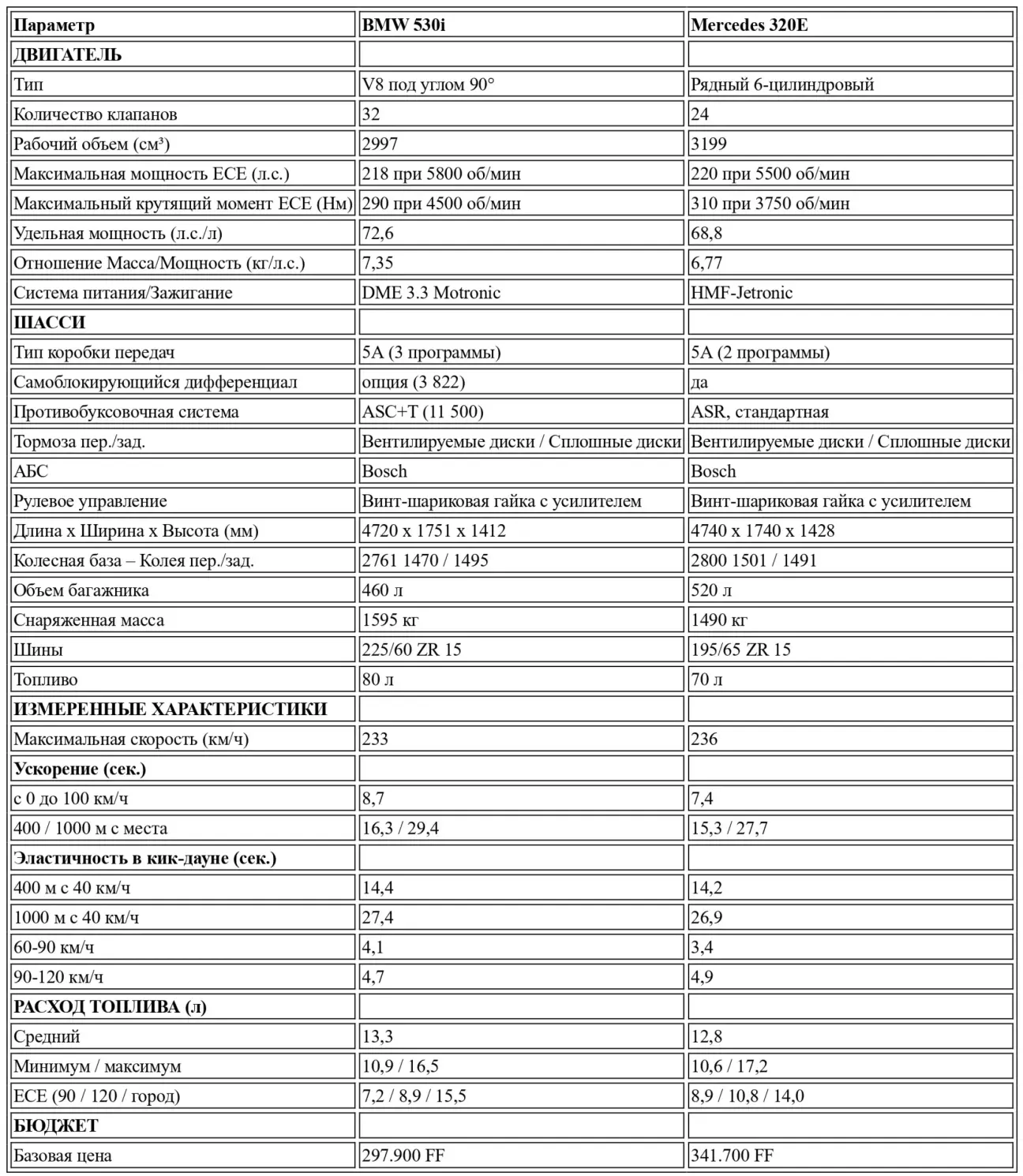 Наши участники этого поединка решили побороться в категории трехлитровых двигателей, которая становится все более конкурентной. Если во время предыдущего сравнения BMW 540i и Mercedes 400E мы были вынуждены констатировать, что у них почти не было прямых конкурентов, то в случае 530i и 320E ситуация совершенно иная. Почти каждый уважающий себя производитель сегодня имеет трехлитровую версию или, по крайней мере, эквивалентную модель с наддувом. В большинстве случаев мощность колеблется в районе 200 л.с. Как BMW, так и Mercedes находятся на ступеньку выше этого барьера. Из своего 3-литрового V8 с 32 клапанами, но лишенного при этом системы изменения фаз газораспределения, BMW удается извлечь 218 л.с. при 5800 об/мин и крутящий момент 290 Нм, который достигается на относительно высоких 4500 об/мин. Однако этот агрегат демонстрирует относительно плоскую кривую крутящего момента, пик которого приходится на довольно позднее время. BMW также пользуется преимуществом, располагая единственным восьмицилиндровым двигателем в этом классе. Это немаловажный козырь с точки зрения престижа.