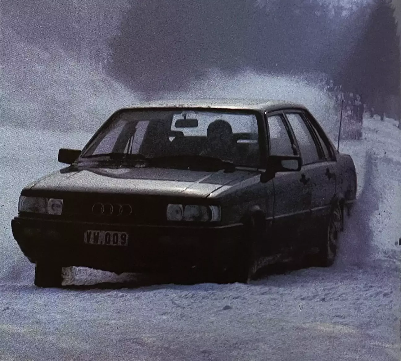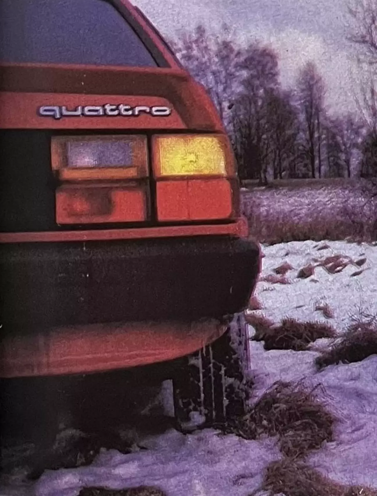 Мое знакомство с Quattro начинается за рулем 80-й на скользкой трассе, состоящей из быстрых и нескольких более медленных поворотов. Больших сюрпризов нет, автомобиль ведет себя так, как можно было бы ожидать, имея книжные знания о данном типе машин, то есть он входит в повороты быстро и с поразительной легкостью, до такой степени, что ты достигаешь зоны срабатывания ограничителя оборотов, не замечая этого. Едва ощутима легкая тенденция передней оси к сносу наружу поворота.