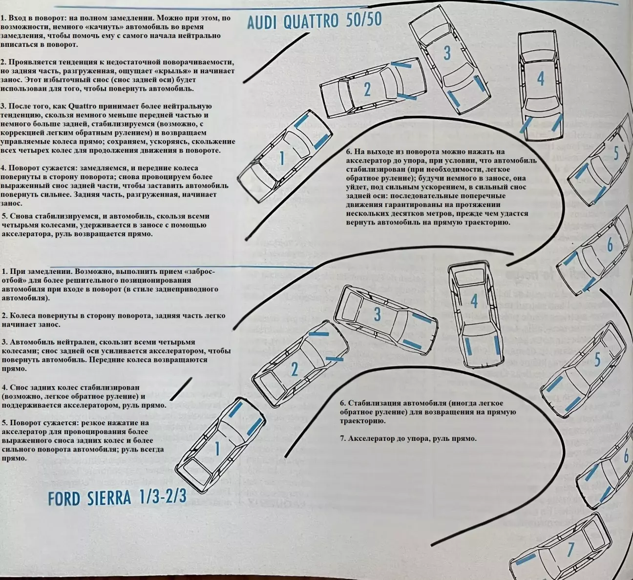 — То есть новые полноприводные автомобили, имеющие распределение 1/3 на переднюю и 2/3 на заднюю ось, оказываются более управляемыми и доставляют больше удовольствия от вождения. Например, на Sierra, благодаря также усилителю руля, невероятно то, что во время движения можно практически не двигать рулем (и это является доказательством эффективности автомобиля), что дает пилоту преимущество всегда быстро и легко определять положение руля. Давно прошли те времена переднеприводных или старых добрых заднеприводных автомобилей, когда приходилось «молотить» рулем, как сумасшедшему, от упора до упора в каждом повороте. На Audi Quattro, наоборот, для коррекции последовательных сносов передних и задних колес все еще приходится «играть рулем», причем основная проблема в поведении Quattro заключается в том, что она страдает от слишком сильного сноса задней оси в конце поворота и недостаточного в начале поворота. На входе в поворот, где она сохраняет выраженную тенденцию к недостаточной поворачиваемости, необходимо обеспечить снос задней оси, отпуская педаль газа (и, возможно, используя технику «левой ноги» или резко выжимая сцепление); затем она на короткое мгновение принимает нейтральное поведение (скольжение всех четырех колес), чтобы затем, и это нужно предвидеть, уйти в довольно сильный занос задней оси. Но все эти маневры, к сожалению, возможны только на высокой скорости, и трудности начинают проявляться в крутых поворотах, проходимых на медленной скорости. Одно из самых сложных упражнений с Audi — это прохождение «шпилек». Другая проблема, которую создает Quattro с ее распределением 50/50, возникает, когда в сужающемся повороте необходимо постепенно усиливать снос задней оси. В этих двух случаях автомобиль с распределением «1/3-2/3» справляется легче, с меньшими движениями руля и большей эффективностью. Все это приводит к тому, что в повороте Audi остается все же довольно непредсказуемой: проходя один и тот же поворот 10 раз, ты проходишь его 10 раз по-разному; в то время как с Sierra, более надежной и гораздо более управляемой, я могу быть уверен, как все пройдет, более чем на 90%. Но с точки зрения тяги, обе они невероятны, это стоит отметить.