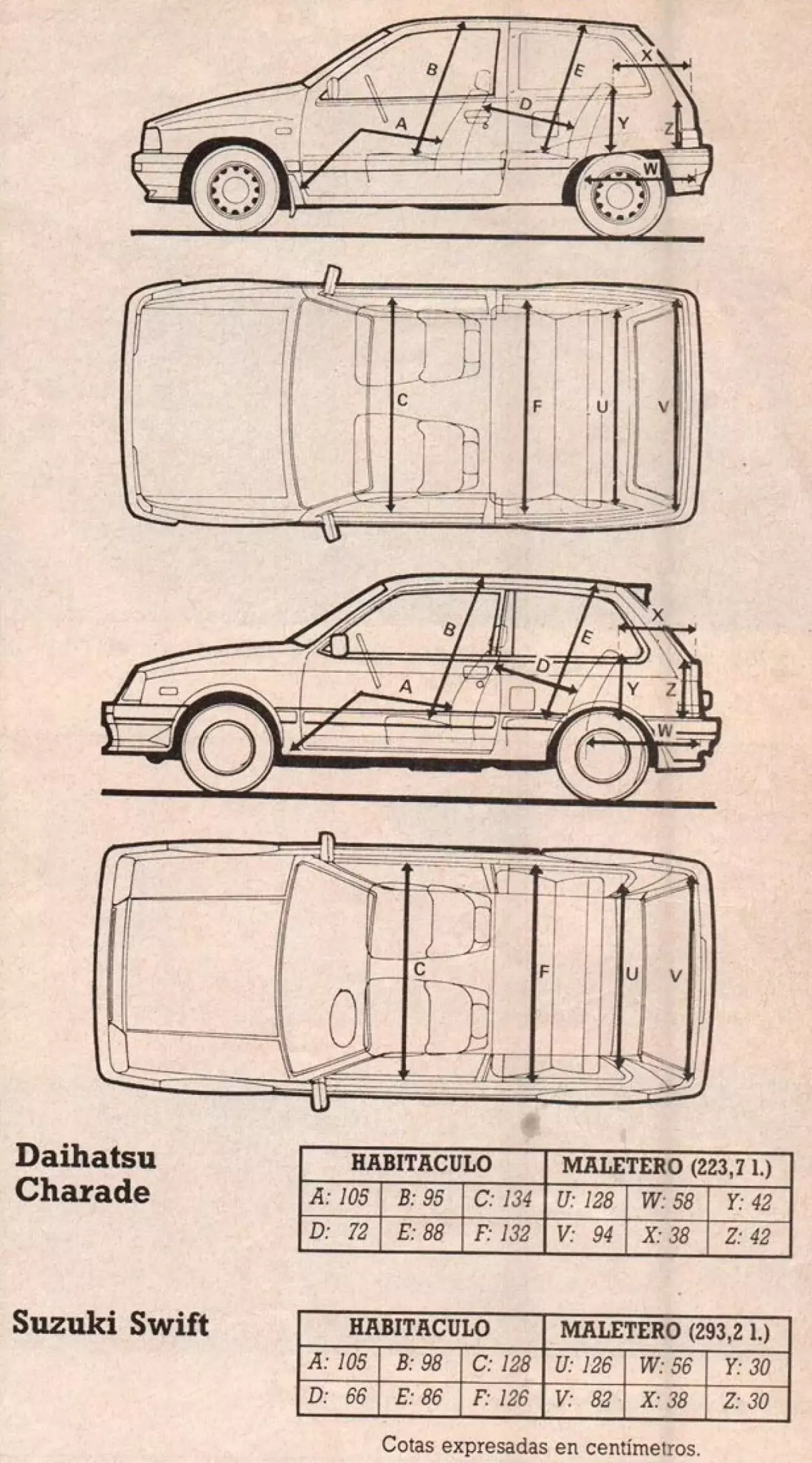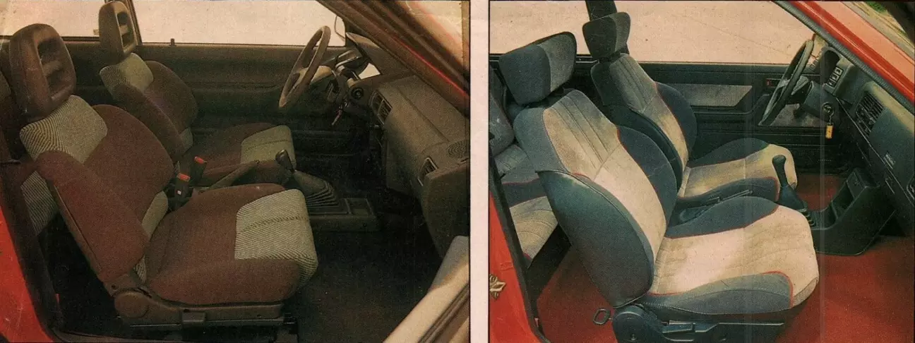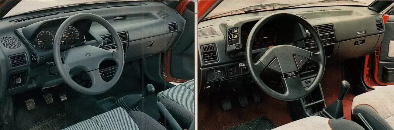 Линии Daihatsu более закругленные, стремясь к максимальному пространству в салоне при максимально сдержанных внешних размерах. В Suzuki преобладают прямые линии, и можно сказать, что его облик немного более традиционен. Внешние размеры также отражают более свежий дизайн Charade. Swift на 6 см длиннее своего конкурента (3,67 против 3,61), но явно уступает в ширине, где Daihatsu превосходит Suzuki на целых 7 см (1,61 против 1,54). Это немедленно отражается на пространстве в салоне, где Charade явно выигрывает как в пространстве, предназначенном для пассажиров, так и в пространстве для багажа; в обоих случаях решающими являются максимальные показатели ширины. Правда в том, что Daihatsu становится новым лидером в этом сегменте (что касается пространства для пассажиров), предоставляя больше простора в салоне, чем Ibiza или Fiat Uno, если привести этих два ярких примера для сравнения.