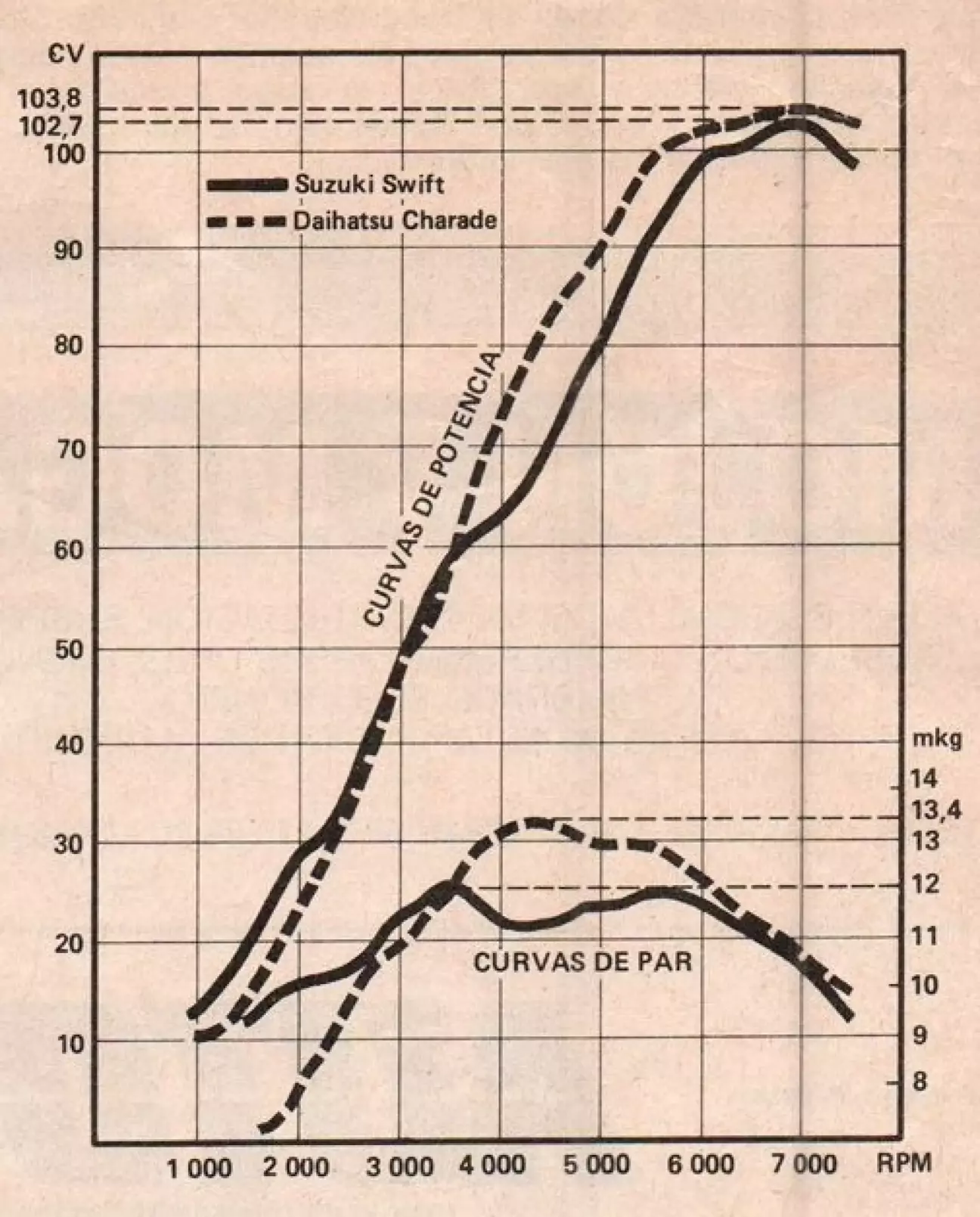 Кривые, которые были получены для этих двух моделей на нашем мощностном стенде, ясно показывают различия между мотором с турбонаддувом и мотором с атмосферным впуском, в данном случае оснащенными четырехклапанными головками цилиндров. В нижней зоне оборотов, ниже 3500 оборотов в минуту, лучший результат показывает Suzuki (атмосферный), но начиная с этого момента, и как только в Daihatsu вступает в действие турбонаддув, мотор с турбонаддувом захватывает лидерство. Как следствие этого, и того, что оба мотора способны достигать высоких режимов вращения, рабочий диапазон Suzuki гораздо шире, чем у Charade, поскольку уже с 2000 оборотов в минуту мы имеем достаточный крутящий момент, в то время как Daihatsu нужно всегда поддерживать выше 3250 оборотов в минуту, чтобы получить от него максимальную отдачу.