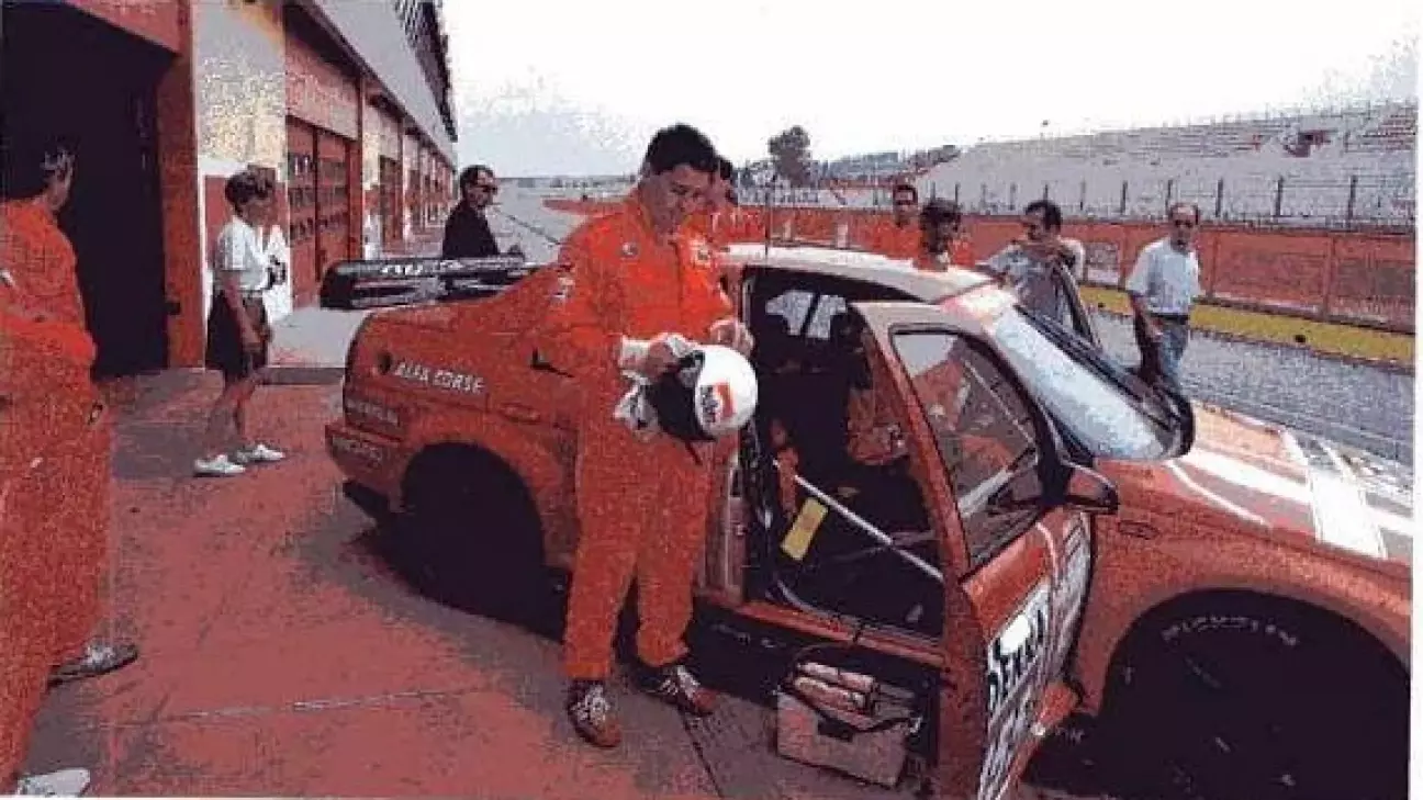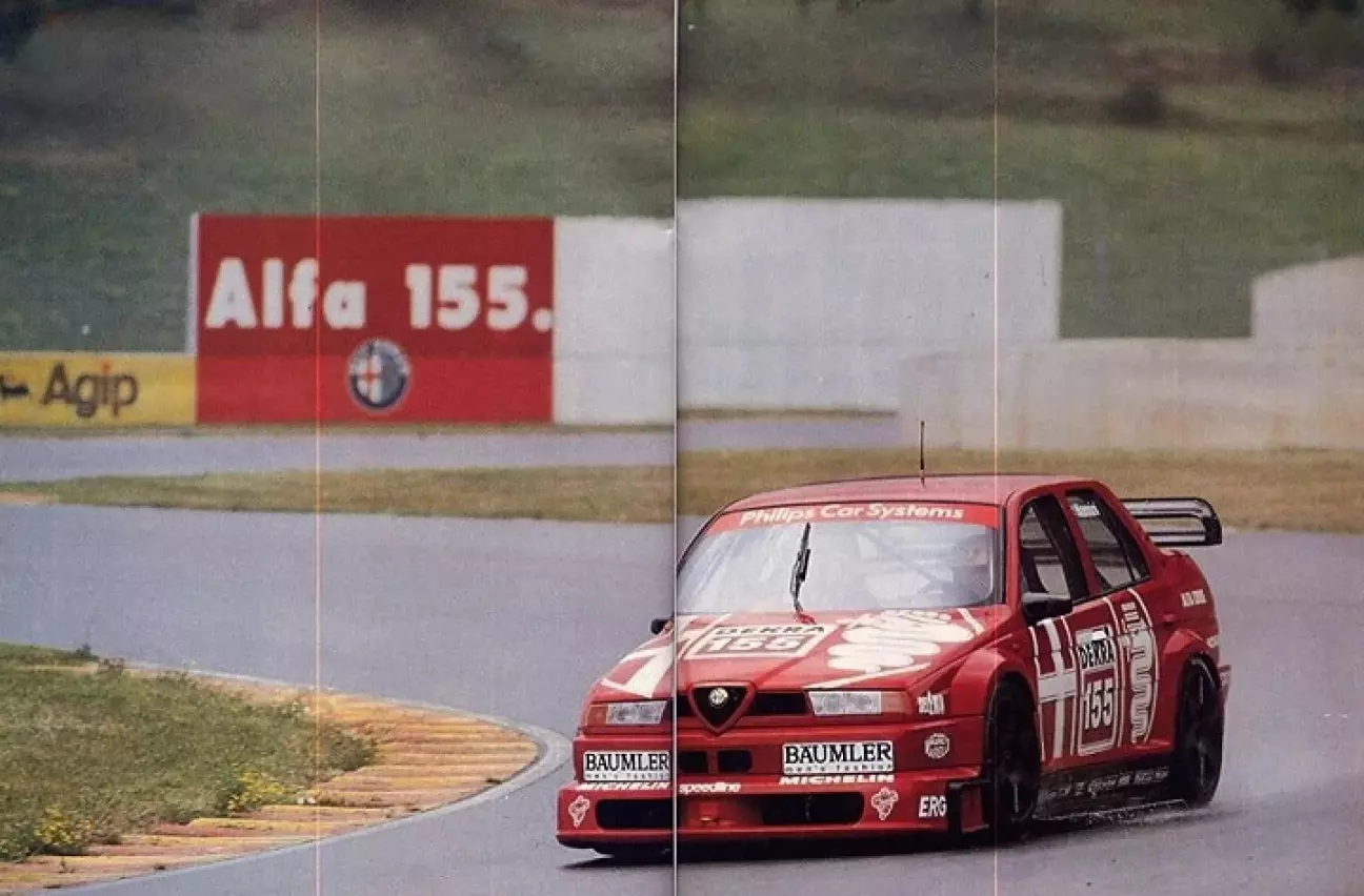 Было дождливое утро. Случайно моя очередь была первой, и благодаря этому — и потому, что шины, еще не проехавшие много, не набрали температуры — пилот-испытатель марки Giorgio Francia не выкладывался полностью на Alfa 155 TI. Эта машина только что прибыла из своего немецкого сезона, в котором Nicola Larini уже одерживает шестую победу в восьми проведенных гонках, практически обеспечив себе этот престижный титул.