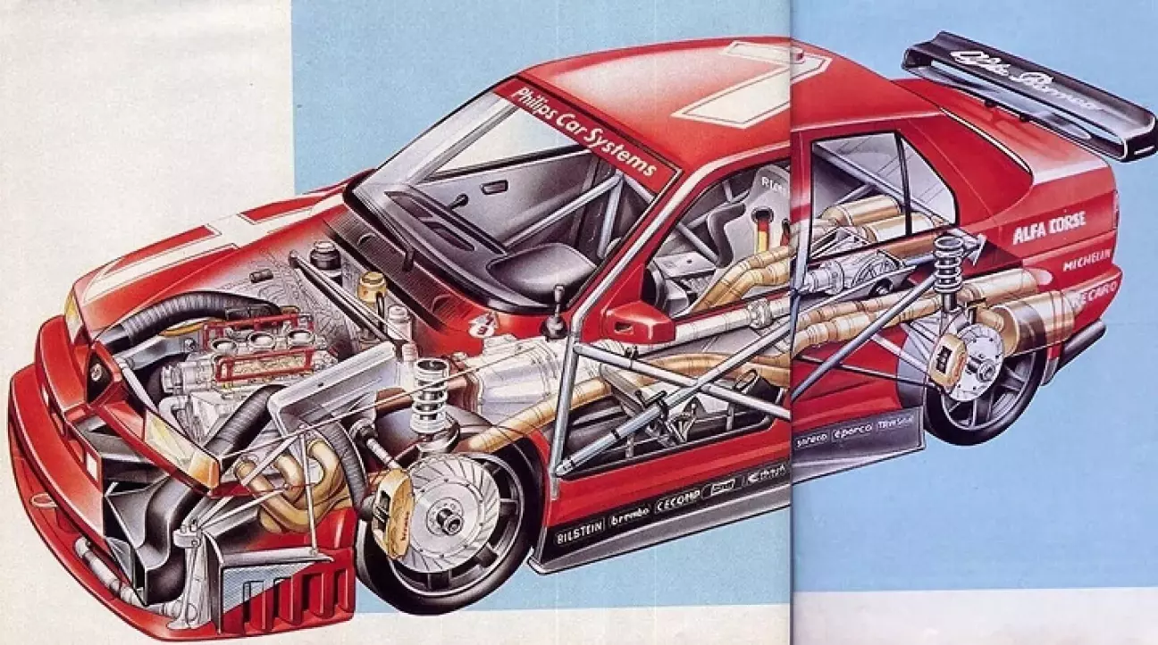Alfa Romeo для DTM имеет трубчатое шасси, приваренное к основе серийного кузова, которое поддерживает подвески, двигатель и коробку передач. Двигатель, который подвешен впереди передней оси, полностью новый: V6 с углом развала 60° и рабочим объемом 2.498 см3, который развивает мощность 420 л.с. при 10.800 оборотах в минуту, с крутящим моментом 294 Нм при 9.000 об/мин. Блок из легкого сплава с мокрыми гильзами из никасила. Головки блока с четырьмя клапанами на цилиндр (впускные из титана) размещают два распределительных вала. Коленчатый вал имеет четыре опоры. Шатуны «Н-образные» из обработанной стали. Смазка с сухим картером, а охлаждение имеет независимые контуры для каждого цилиндра. За электронное управление отвечает компьютер Weber-Marelli «Step 4», производный от Формулы 1. Выхлопная система заканчивается двумя ультралегкими каталитическими нейтрализаторами (обязательными, согласно нормам, действующим в этом Чемпионате Германии), при этом выхлопные газы действуют как ускоритель потока воздуха.