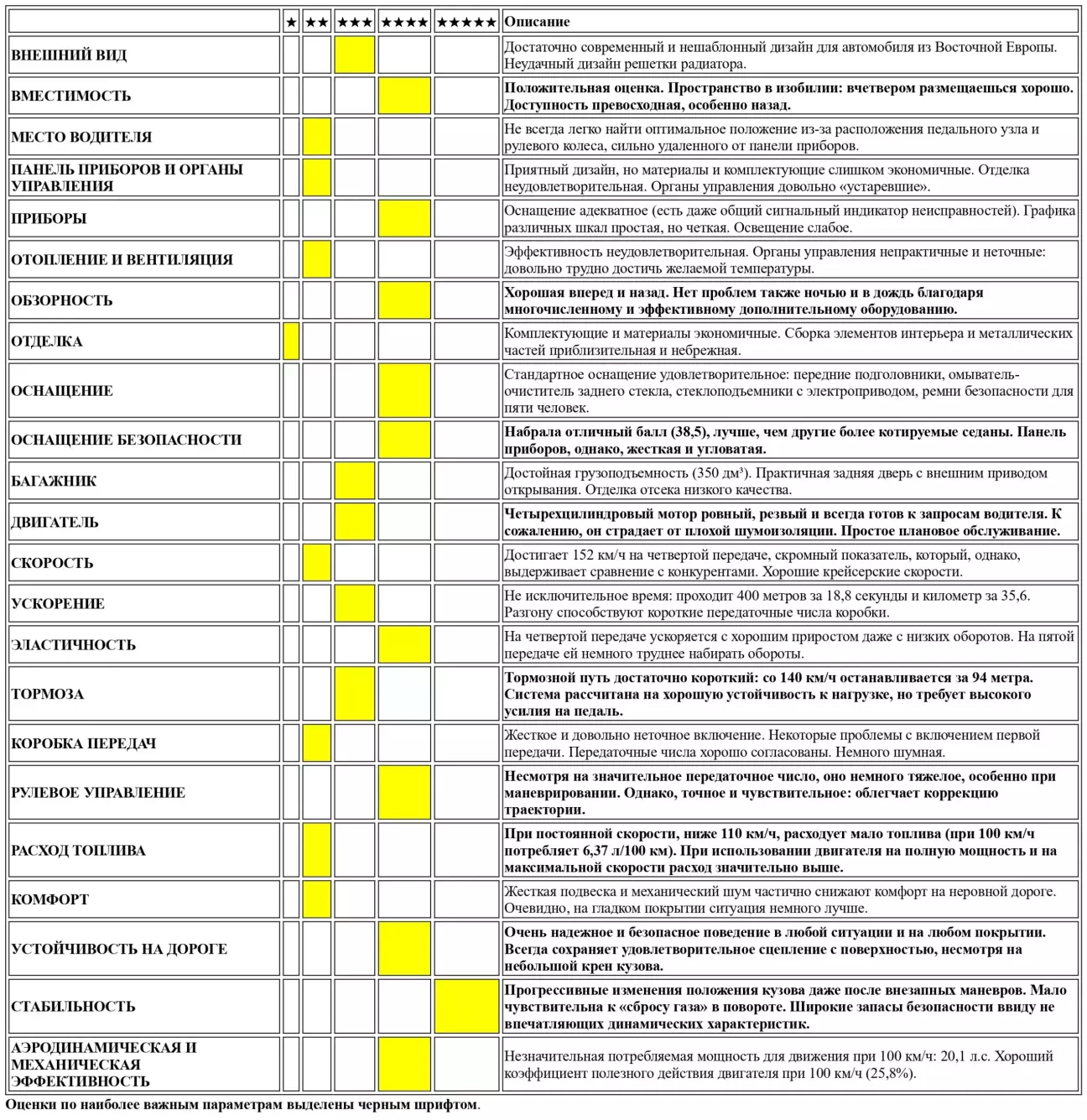 Условные обозначения: + — Лучший показатель, - — Худший показатель; В скобках указан номер журнала Quattroruote, в котором был опубликован дорожный тест.