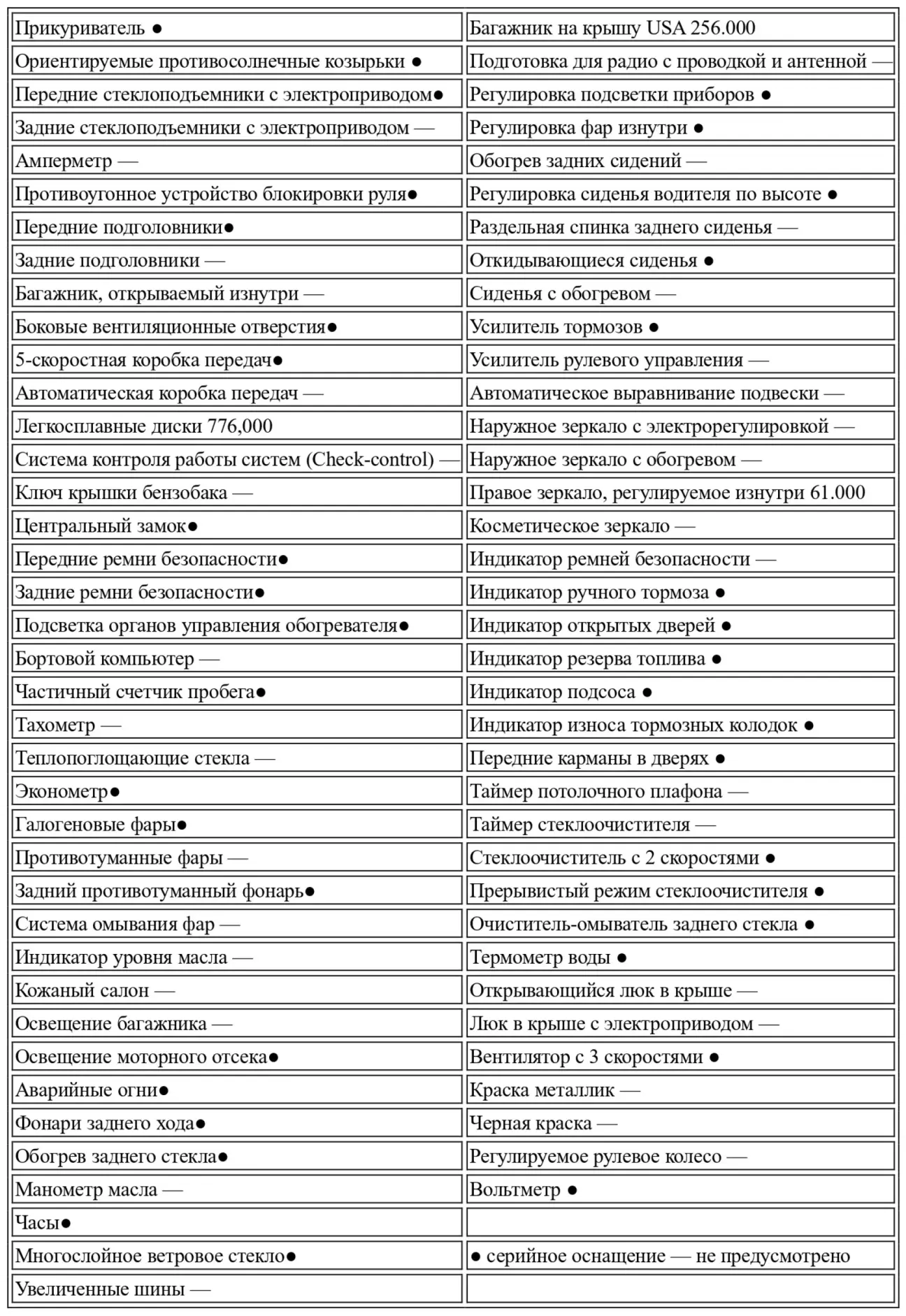 Комплектация полная и превосходит то, что предлагают другие автомобили той же категории, возможно, более дорогие; в комплектацию входят, среди прочего, пятая передача, передние подголовники, ремни безопасности для пяти человек, омыватель стекол с обогревом, регулировка пучка света и стеклоподъемники с электроприводом. Также имеются эконометр и зеркало заднего вида, регулируемое изнутри. К сожалению, отсутствуют боковые стекла, открывающиеся поворотным способом (по типу форточек), и складывающаяся по частям спинка заднего сиденья.