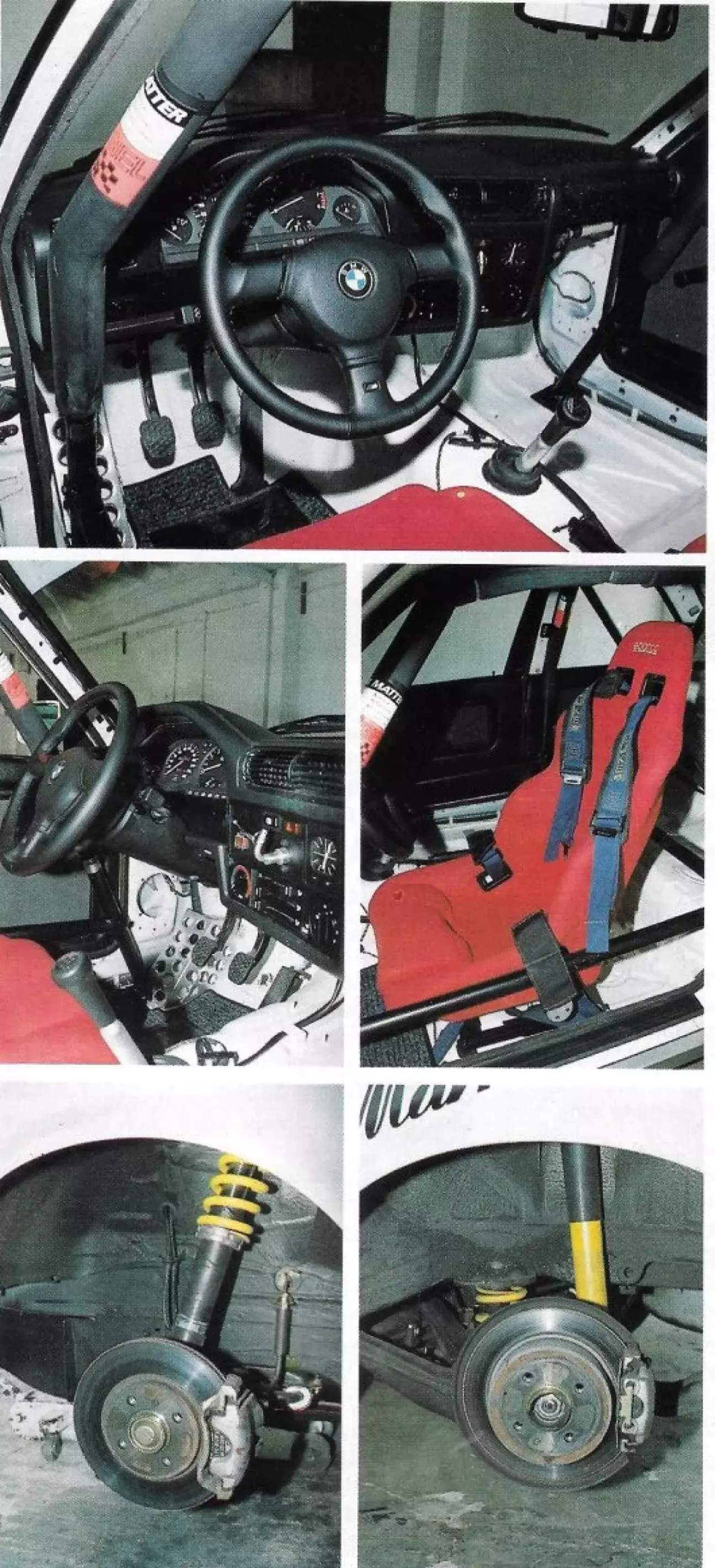 Фактор безопасности нельзя было забывать, как того требует регламент группы N, в которую входит 320is. Таким образом, трофейная версия дополнительно оснащается системой автоматического пожаротушения, которая приводится в действие от баллона объемом 4 кг, и каркасом безопасности марки Matter. Существует также система пожаротушения с электрическим управлением той же марки и выключатель массы, который дополняет контур безопасности. Салон практически обнажен, из оригинальных деталей остаются только панель приборов (торпедо), обшивка дверей, рулевое колесо и рычаг коробки передач. Пол представляет собой открытый металл, выделяется каркас безопасности с несколькими точками крепления, который охватывает большую часть интерьера. Рядом с педалями находится опорная площадка, которая в случае длительных соревнований или в сложной ситуации может быть очень полезна пилоту. Что касается органов управления, одна из единственных возможных регулировок относится к рулевому колесу: между ним и рулевой колонкой можно установить проставочное кольцо для улучшения положения за рулем, если в этом есть необходимость. В тормозной системе можно удалить систему ABS, при этом главный тормозной цилиндр начинает непосредственно приводить в действие тормоза каждого колеса. Серийный материал тормозных колодок также может быть заменен на другой, с иными характеристиками, более подходящий для спортивного вождения.
