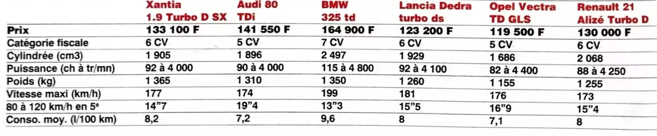 Xantia напрямую конкурирует с 405, 21, 155 и другими, например, Vectra, но она также рискует нанести последний удар своему старшему брату XM, чьи продажи уже стали весьма ограниченными. Xantia Turbo D SX стоит 133 100 F, против 147 200 F за базовую дизельную XM (83 л.с.). Но по этой цене XM гораздо менее динамичен, поскольку лишен турбонаддува: 37 секунд на 1000 м с места против 35,5 у Xantia, 165 км/ч вместо 177 км/ч и 25,7 секунды в режиме эластичности с 80 до 120 км/ч на 5-й передаче, что на 10 (!) секунд дольше, чем у Xantia. Тут нет никаких возможных сомнений! Если сравнить Xantia Turbo D с XM turbo D 12 (109 л.с.), то разница в динамике будет в пользу XM... за исключением эластичности. Более того, линейка XM turbo D 12 начинается со 164 200 F, что почти на 10 000 F дороже самой дорогой Xantia 1.9 Turbo D... Кроме того, следует знать, что Xantia более приятна в управлении, экономичнее, лучше собрана и дешевле, чем XM. К тому же, внутреннее пространство у них почти эквивалентно.