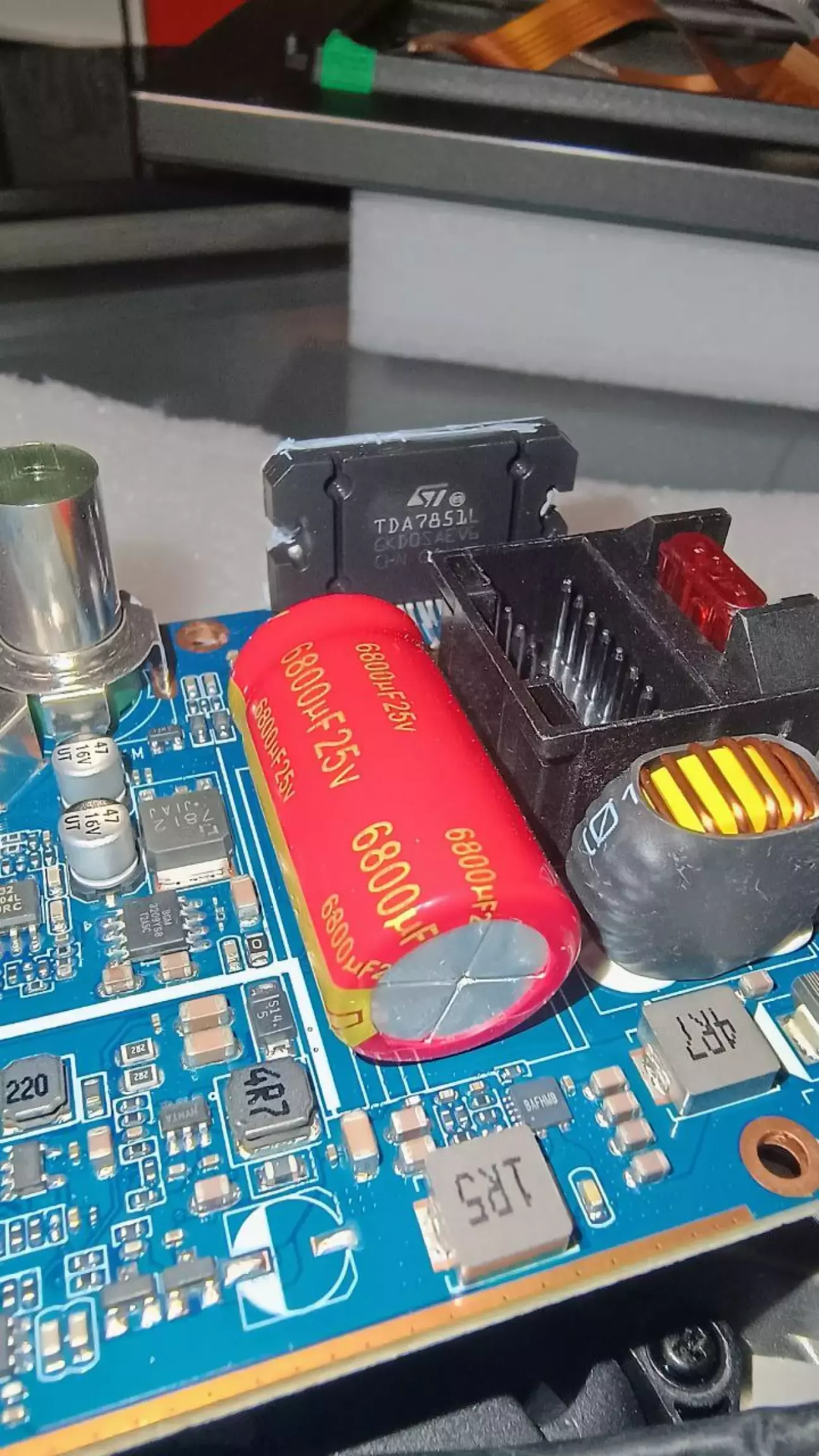 А от мосфетик TDA7851L. І ні, цього разу ми паяти не будемо, бо голова у Ворзелі, а огляд робиться з Ужгорода. Конденсатор 6800мкФ.
