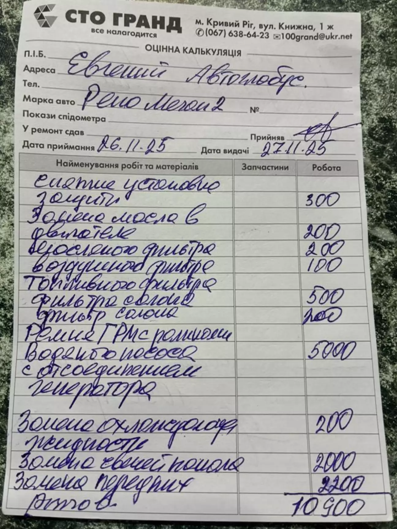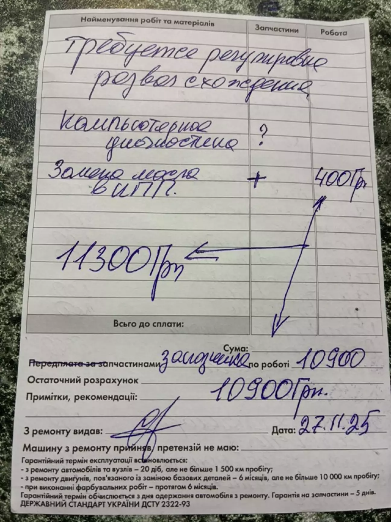 Трохи не так підписали авто, чогось майстер вирішив що це друге покоління, ну то таке)) Загалом вийшло 11300 грн за роботу + ще мабуть +/- 500 грн за розвал візьмуть