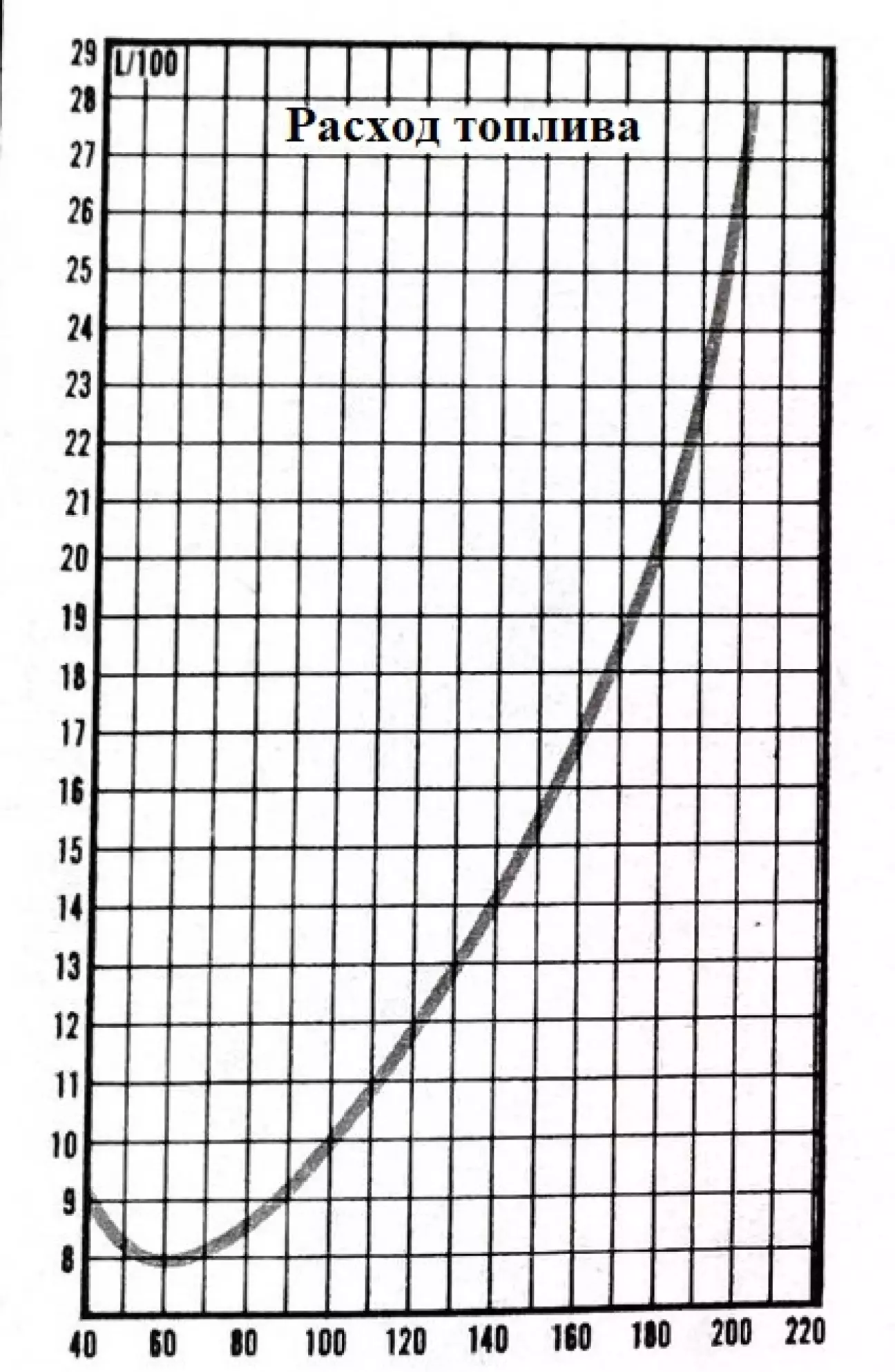 Конечно, необходимо упомянуть расход топлива. Читатель с интересом ознакомится с кривой, составленной нами, но на практике мы получили экономичный расход 10,45 л/100 км при средней скорости 75 км/ч. Одновременно, при совершенно неэкономичном вождении, то есть при средней скорости выше 100 км/ч на любом типе дороги, я зафиксировал 21,6 л/100 км.