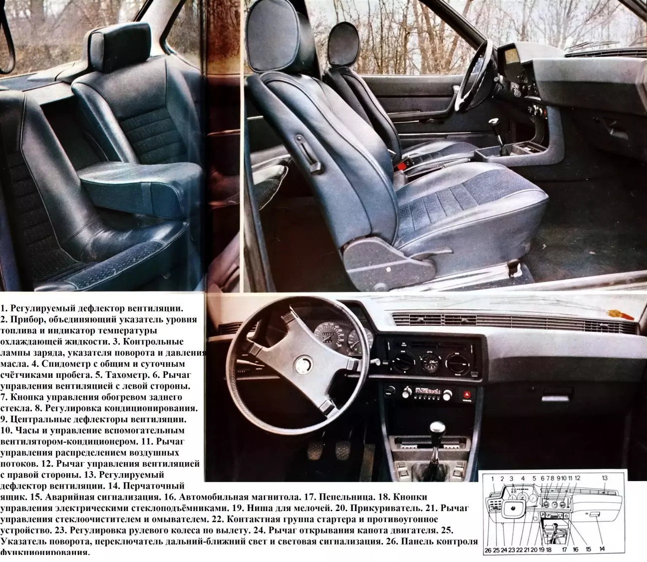 Наша версия «металлик» была обтянута тёмно-синим цветом, от ковриков до сидений, не забывая о задней полке: изысканный ансамбль. Только светло-серый пластик, которым обит салон, разочаровывает своей банальностью и заурядностью. Одно замечание хозяйки: тёмный велюр, отделанный полосами, задерживает и удерживает пыль. Сиденье жёсткое, но хорошо продуманной формы, которая обеспечивает безупречную поддержку. Водительское сиденье регулируется по высоте, в то время как рулевое колесо регулируется по вылету (а не по высоте, как у некоторых именитых итальянок). Независимо от того, длинные у вас или короткие руки, бесконечные ноги или маленький размер, невозможно не найти идеальное положение для вождения. Рабочее место водителя центрировано вокруг него, как это уже было в моделях 3-й серии. Индикаторы, контрольные лампы, циферблаты, отопление и вентиляция — всё это несёт бдительную вахту рядом с ним. Только часы плохо читаются в верхней части из-за зубчатого обода, который их окружает и управляет вентилятором.