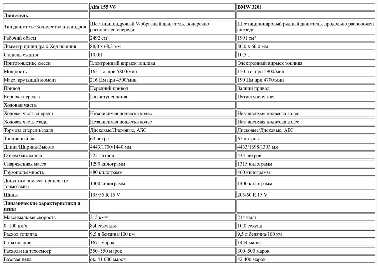 Рольф Х.: «Верно, потому что несколько сухих цифр являются объективными судьями: динамические характеристики Alfa лучше, расход по циклу ECE идентичен. Базовая цена V6-Alfa должна быть ниже, чем у BMW 320i, и составлять 41 000 марок».