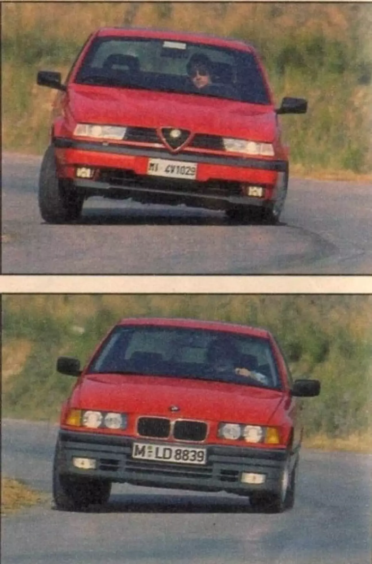 Место действия: усаженное пальмами побережье к югу от Барселоны. Сюжет: дуэль двух седанов. Действующие лица: красная BMW под названием 320i (150 л.с.) и красная Alfa 155 V6 (165 л.с.), которая вместе со своей младшей сестрой Alfa 155 Twin Spark 2.0 (143 л.с.) выходит на немецкий рынок в апреле. Режиссер: два тестера Auto Bild, придерживающиеся противоположных мнений. Рольф Х. считает себя убежденным альфисти (Alfisti): «И передний привод ничего не изменит». Рольф Б. напротив, морщит нос: «Передний привод окончательно кладет конец старым добрым временам Alfa. От этого автомобиля пахнет Fiat’ом отовсюду». В этом духе, приступим к бою...