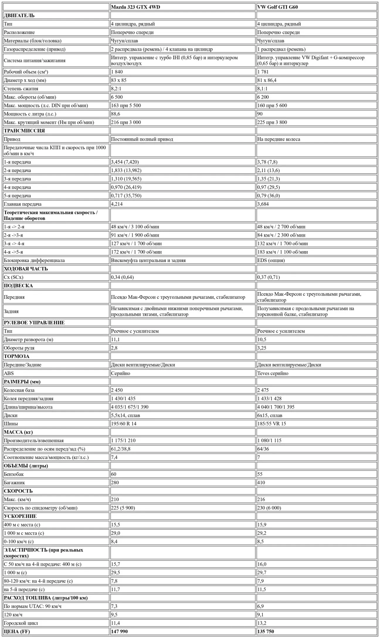 С распределением крутящего момента в пользу задней оси, новая 323 GTX 4WD стала более спортивной, более забавной, тем более что увеличение рабочего объема значительно улучшило характеристики двигателя. Она не только динамична, но и очень эффективна, хорошо отделана, очень хорошо оснащена и не слишком дорога, учитывая предлагаемые качества. Но не обманывайте себя, наличие полного привода не означает, что за рулем Вам позволены любые вольности. Дополнительная эффективность не обязательно ведет к упрощению. Пример тому — сравнение с Golf, оснащенным противобуксовочной системой. Благодаря этой опции, которая, как следует из названия, ограничивает потерю сцепления передних колес, немецкий автомобиль остается легким в освоении для любого водителя. Будучи чуть менее эффективным на крайнем пределе, менее изощренным технически, он остается очень надежной величиной. Для тех, кто считает его слишком серьезным, есть решения, например, отказаться от опции EDS или обратиться в тюнинг-ателье, чтобы добавить несколько лошадиных сил. В любом случае, обе машины превосходны, и не совсем по одним и тем же причинам, что, впрочем, и лучше. На этот раз нельзя установить иерархию с помощью четко определенных критериев, поскольку сердце может высказаться, не опасаясь потерять рассудок.