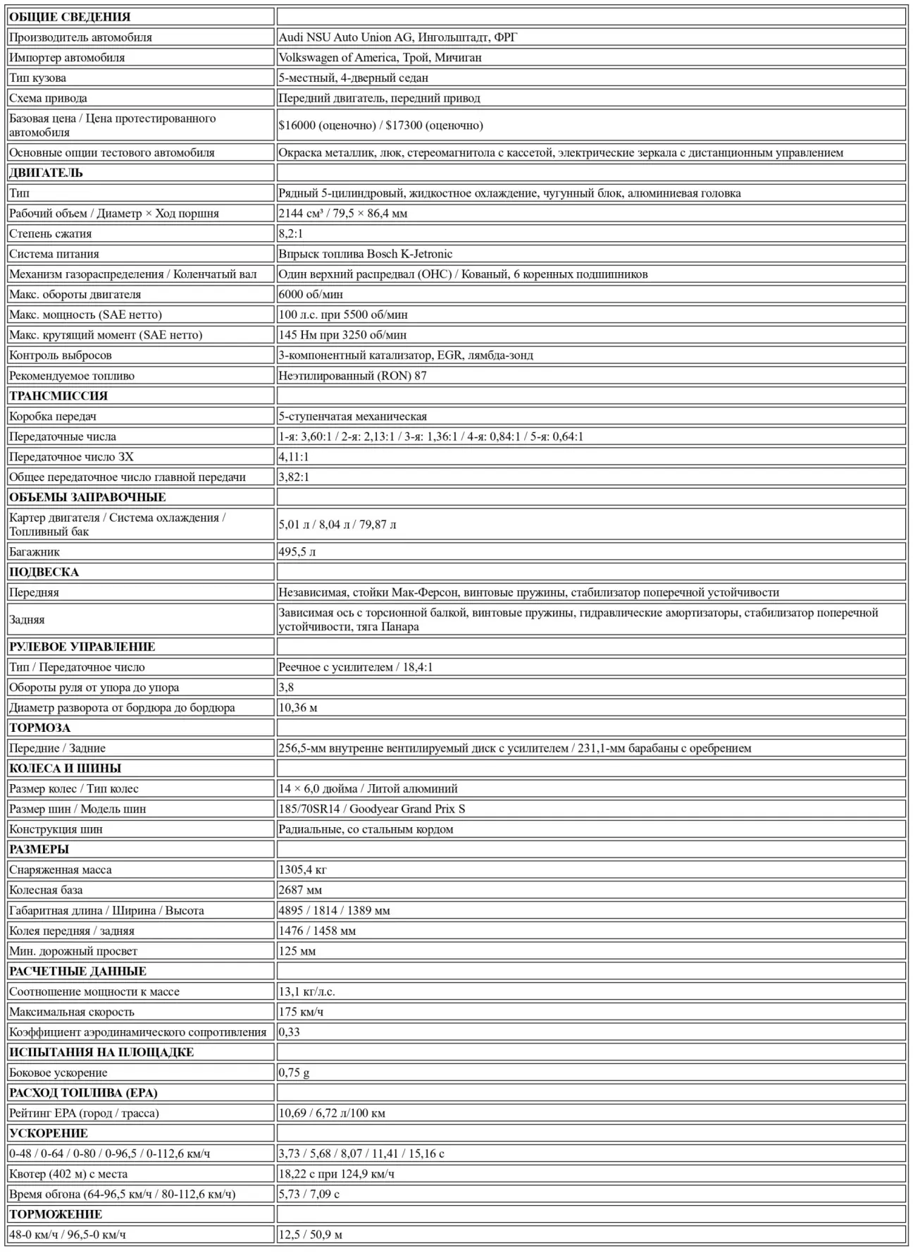 Расположение приборов и органов управления хорошее, как и в случае с предыдущей Audi 5000, хотя мы не можем согласиться с Audi в том, что приборы являются полными. Помимо спидометра и тахометра, есть только указатели уровня топлива и температуры охлаждающей жидкости — достаточно, возможно, для чего-то вроде Edsel Ranger, но не для автомобиля со спортивными стремлениями и репутацией, как у этого. Audi оправдывает такое широкое использование контрольных ламп-индикаторов тем, что вождение — это серьезное дело, и для водителя должно быть как можно меньше отвлекающих факторов. Мы относимся к этому обоснованию с большим подозрением.