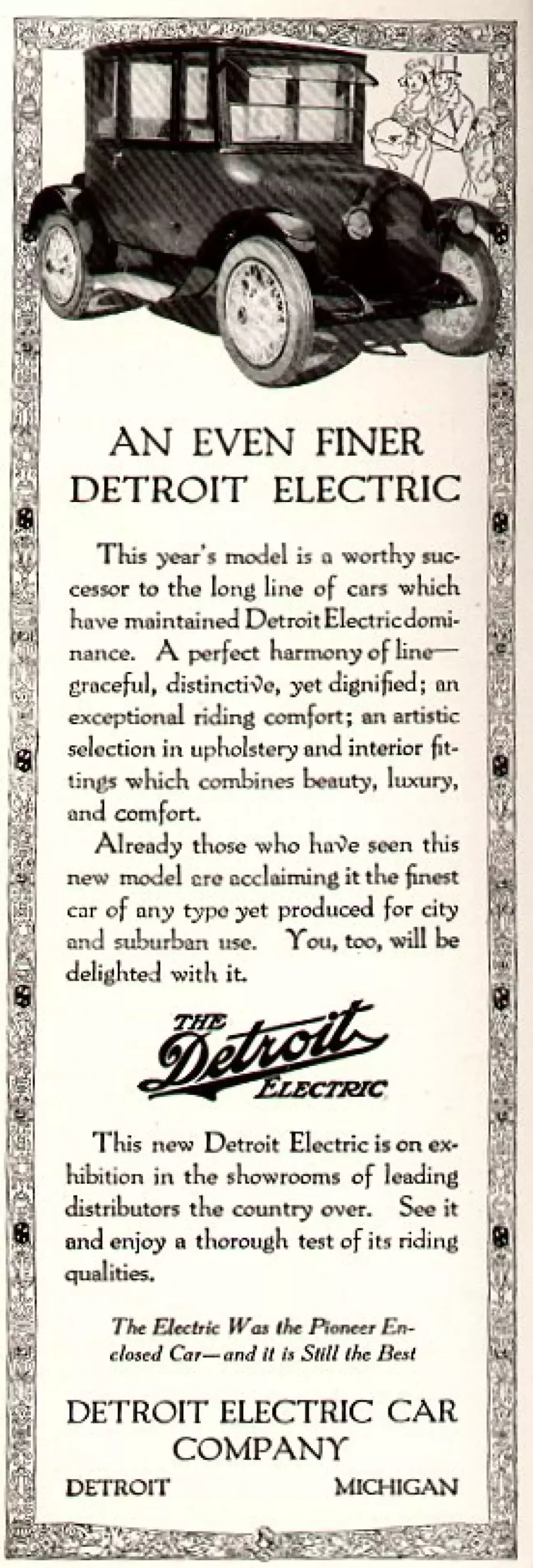 Як нам підказує назва, компанія ця Американська, і заснована вона була у Детройті) Проіснувала вона до 1939 року і займалася виготовленням електромобілів. Назву Detroit Electric компанія здобула у 1907 році, коли і почала виготовлення автівок. А заснована вона була ще 1884 році під назвою Anderson Carriage Company. По суті Detroit Electic була дочірнім підприємством Anderson Electric Car Company.