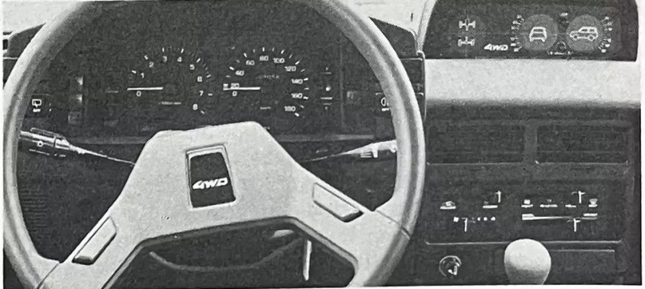 Мы уже упоминали большинство многочисленных элементов стандартного оснащения Toyota Tercel 4WD в соответствующих главах: например, два наружных зеркала с регулировкой из салона, задний стеклоочиститель/омыватель или радиоантенна. Приборная панель использует тот же дизайн, что и в базовой Toyota Tercel, но дополнена небольшой консолью, в которой расположены индикатор 4WD и клинометры. Центральный блок приборов содержит, помимо спидометра, счетчик оборотов, суточный одометр, термометр воды, указатель уровня топлива (с индикатором резерва) и маленькие кварцевые часы с цифровым LED-дисплеем. Имеются контрольные лампы стояночного тормоза/уровня тормозной жидкости, открытия двери, а также двухцветный индикатор economy.
