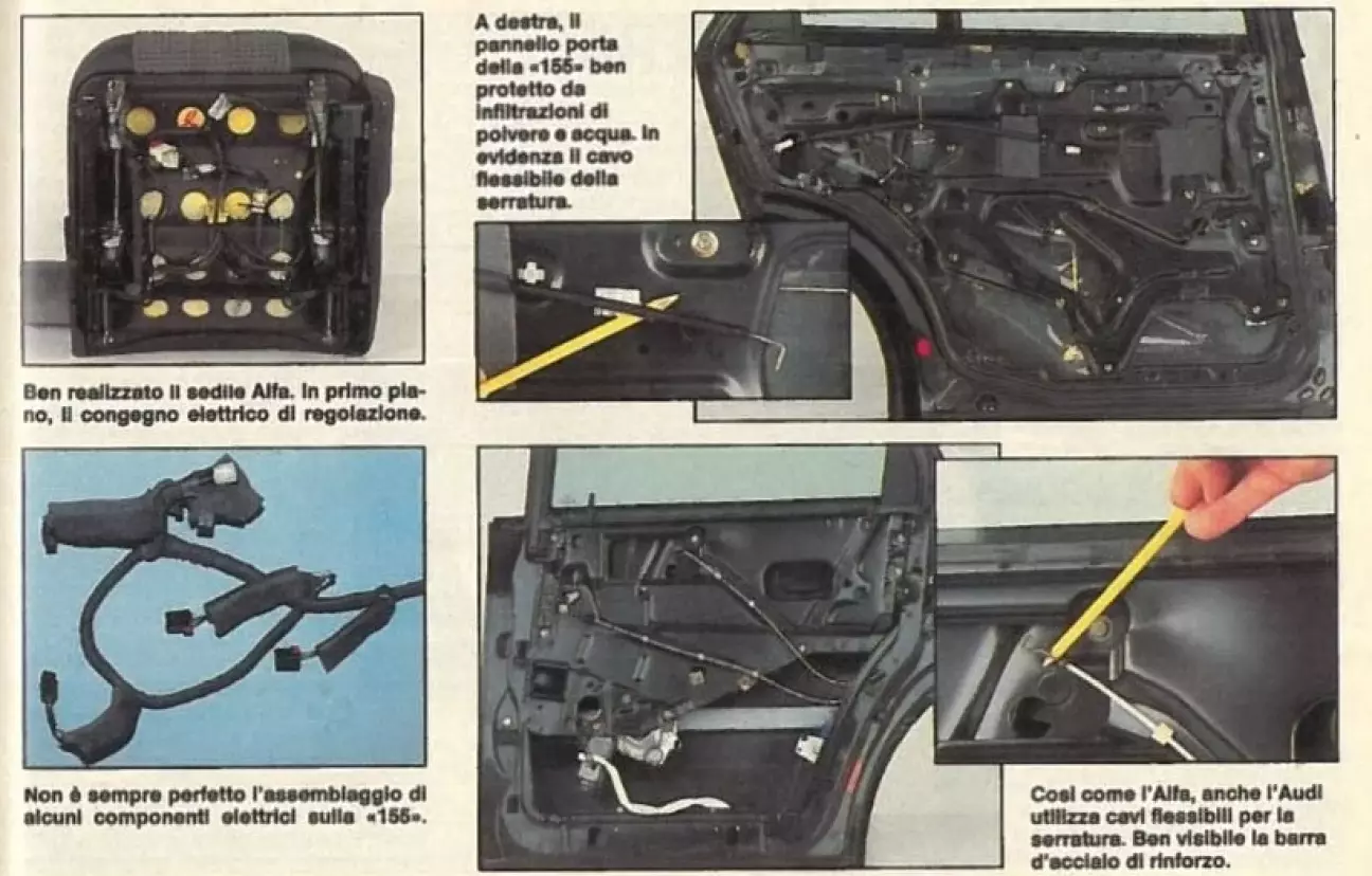 После тщательного и углубленного анализа используемых материалов и конструктивных технологий мы могли только подтвердить отличный уровень немецкой машины. Нас особенно впечатлила тщательность сборки элементов салона: использованы отличные материалы, соединения различных панелей выполнены без заусенцев и неточностей, качественная обивка сидений. Также хорошо продумана шумоизоляция. Мы обнаружили звукопоглощающие и звукоизолирующие материалы повсюду: на полу, между приборной панелью и моторным отсеком, внутри дверных оболочек, которые, кстати, усилены прочными стальными стержнями. Кроме того, все электрические разъемы были покрыты мягкой пеной, чтобы ограничить мелкий шум, вызванный ударами о кузов. Те же меры предосторожности, кстати, мы обнаружили и на Alfa. Однако ее уровень качества еще не достиг высоких немецких стандартов. Многие детали еще предстоит улучшить. Например, на тестовом экземпляре мы обнаружили отклеившиеся панели обеих задних стоек, многочисленные неточности сборки и недостатки в креплении и расположении электропроводки. Напротив, сиденья, изготовленные из пены, которая идеально принимает форму тела в зависимости от различных сил, оказываемых им на отдельные части набивки, выполнены хорошо.