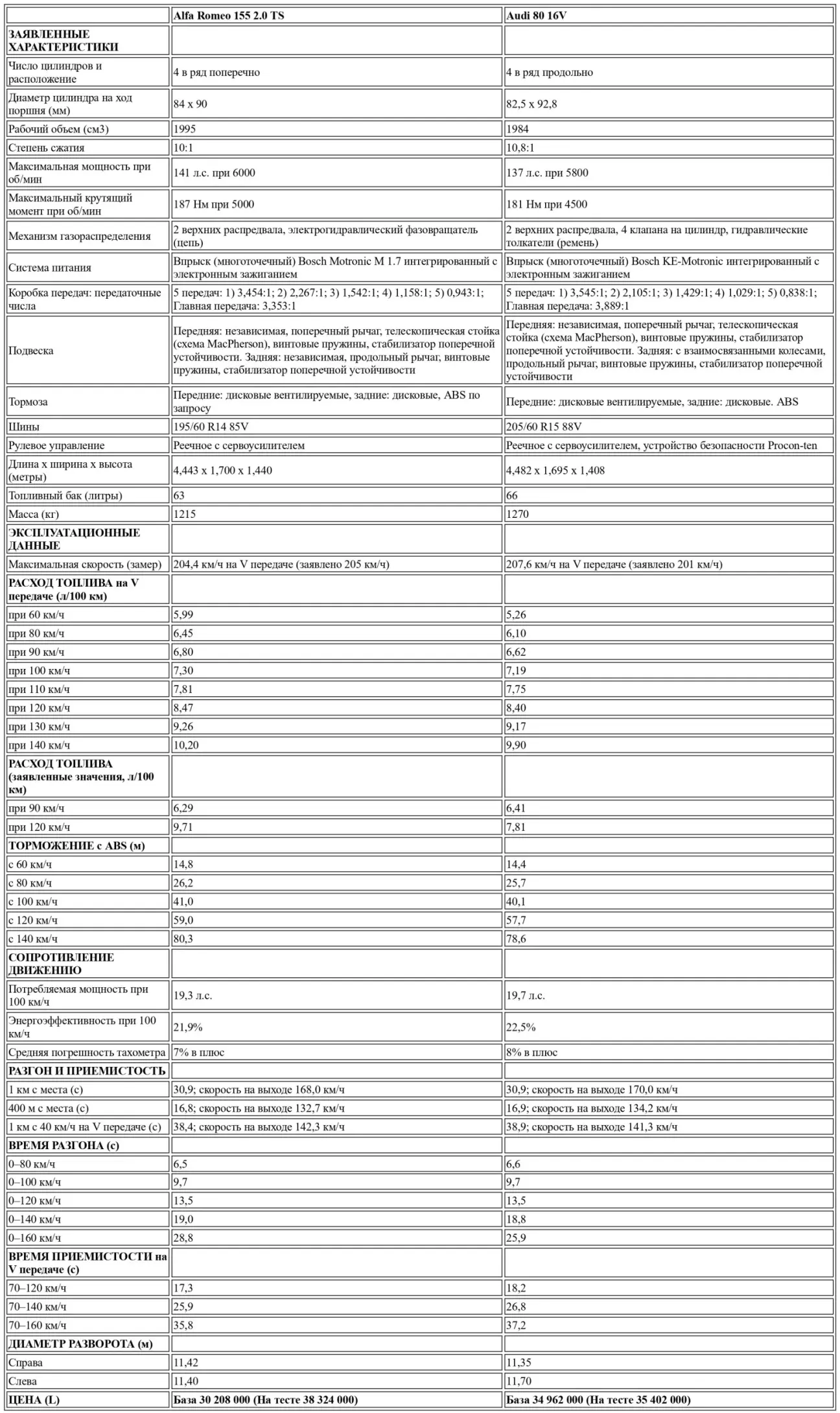 Естественным соперником для Alfa в классе двух литров всегда была BMW. Однако в последние годы среди любителей вождения также завоевала признание Audi, известная моделями с полным приводом. Мы сравнили 16-клапанную версию новой 80 с 155 Twin Spark, которая резвее, но менее комфортабельна.