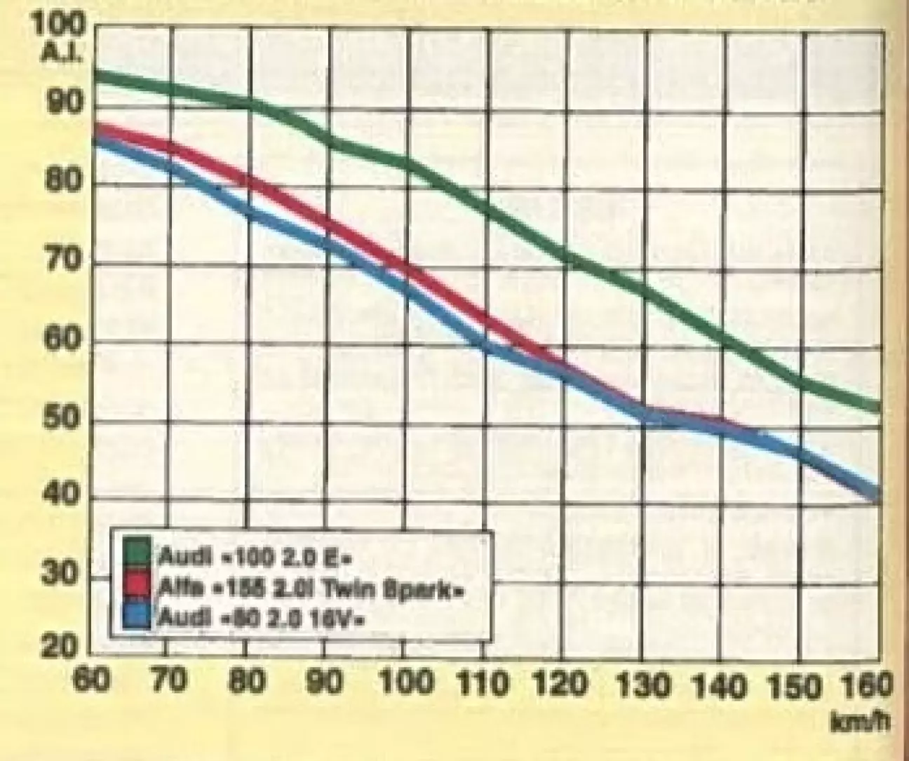 Менее удачным оказалось сочетание двигателя и коробки передач у 16-клапанной немецкой машины. Не из-за каких-либо особых недостатков трансмиссии Audi, а из-за хронической вялости на низких и средних оборотах двигателей с более чем двумя клапанами на цилиндр. Что больше всего раздражает водителя, так это чрезмерное падение оборотов между переключениями передач и, главное, последующая медлительность двигателя в наборе скорости. По сравнению с 20-клапанным двигателем, установленным на 90, который уже критиковался Quattroruote именно из-за этих характеристик, некоторый прогресс был достигнут, но улучшения все еще недостаточны, чтобы придать 80 необходимую эластичность хода. Этот предел немецкой машины частично подтверждается результатами тестов на приемистость. Секундомер, по сути, зафиксировал едва приемлемое время: почти 27 секунд для разгона с 70 до 140 км/ч и чуть менее 39 секунд для прохождения километра с 40 км/ч, против 25,9 и 38,4 секунд соответственно у 155. Более утешительными являются результаты теста расхода топлива. 80 подтверждает, даже в этой многоклапанной версии, что является довольно умеренным в потреблении автомобилем как на постоянной скорости, так и при нормальном использовании. Даже при некоторой активации двигателя ей легко удерживать средний расход выше 10 км на литр, что составляет менее 10,0 л/100 км. 155 не уступает ей, особенно на автомагистралях, где она может извлечь пользу из хорошей аэродинамической формы и правильного подбора передаточных чисел коробки передач (пятая рабочая передача, обеспечивающая 34 км/ч на 1000 оборотов). Средний расход Alfa немного увеличивается, если придерживаться яркого стиля вождения.