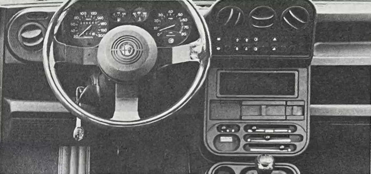 Alfa 33 1.5 Quadrifoglio — это образец современного итальянского стиля! Она стремится быть комфортной и гостеприимной, и она, безусловно, такова, даже если не всегда понятны решения, сделанные итальянскими стилистами. Так, приборная панель не самая удачная. Она напоминает скорее кабину вертолета, чем автомобиля, с массовой концентрацией органов управления и воздуховодов в центре автомобиля, чтобы оставить только приборы, собранные в единый шарнирный блок перед водителем, за рулевым колесом. В этом плане выбор инженера Рессони не является выдающимся. Он также не объясняется ограничением площади остекления, особенно для задней части салона, с уменьшенным стеклом задней двери (благодаря дизайну задней двери) и значительной толщиной задних стоек крыши («C»). Напротив, 33 явно демонстрирует свое чувство гостеприимства выбором материалов обивки, как для сидений, так и для боковых панелей и потолка, а также внешним видом сидений.