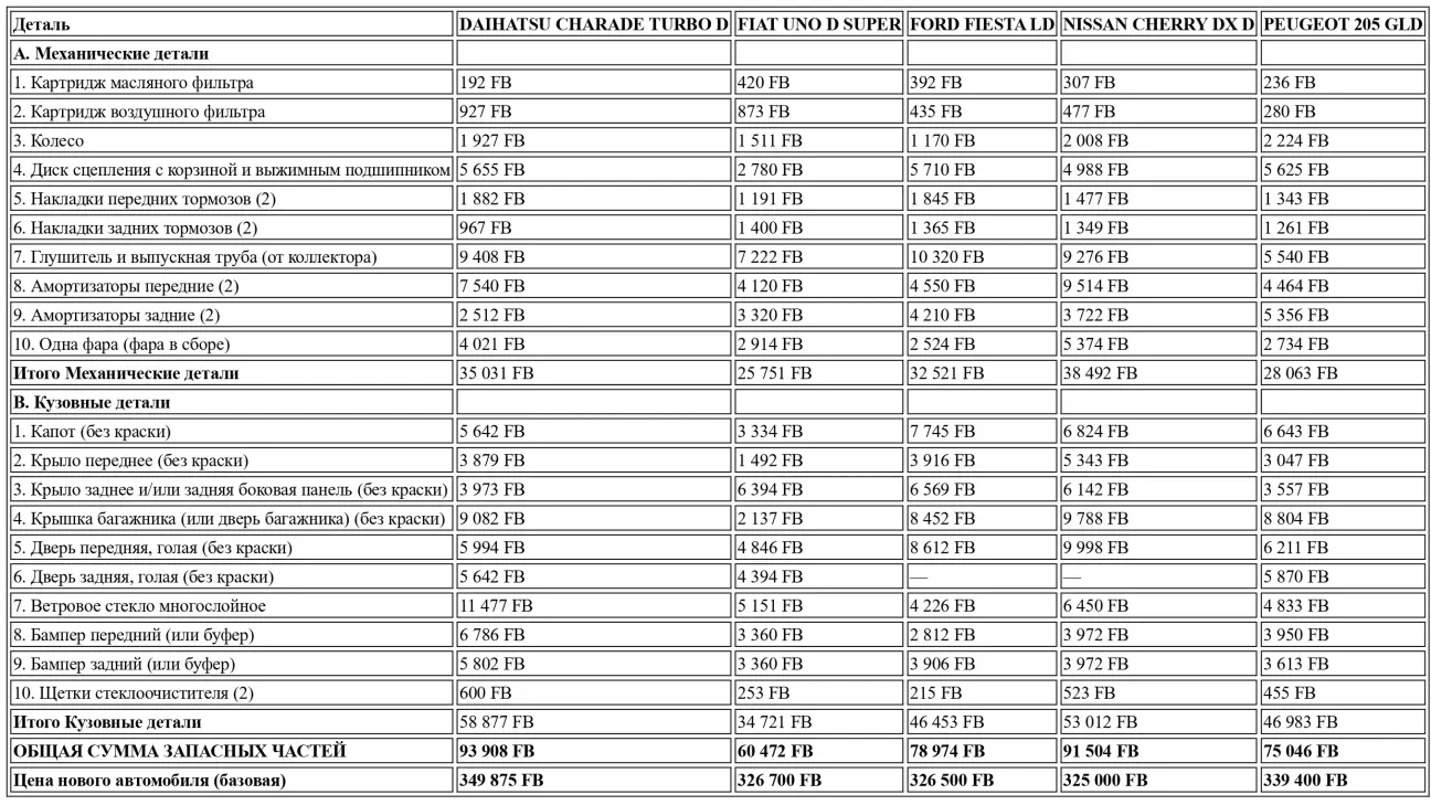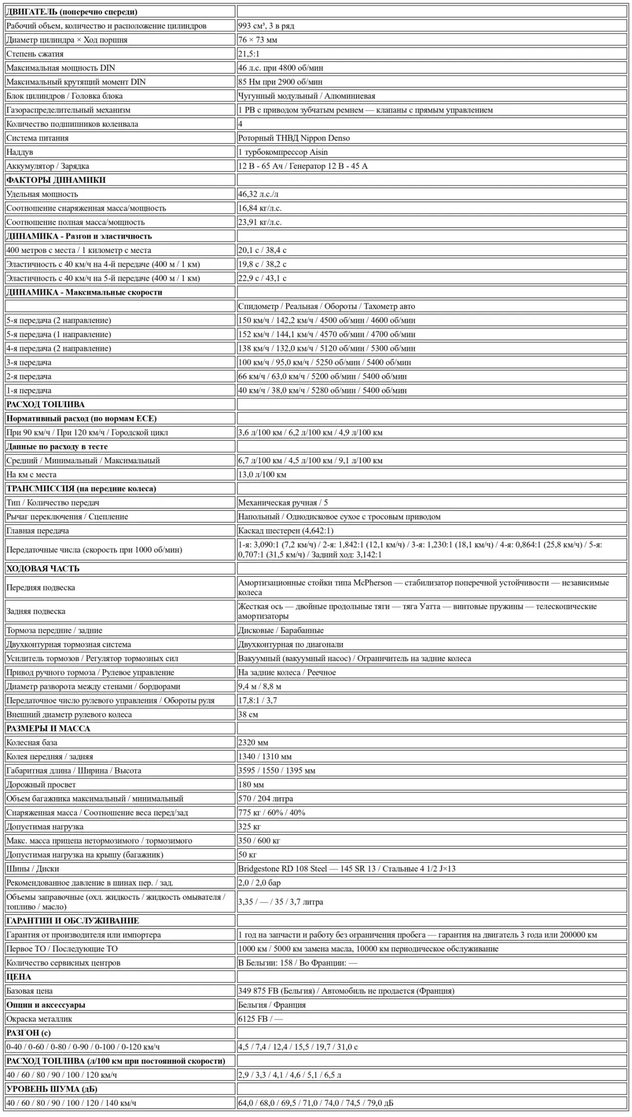 В настоящее время гамма Charade, импортируемая в Бельгию, насчитывает не менее 13 моделей, в диапазоне цен, варьирующемся от 221.188 F за самую дешевую (бензиновая модель 1000 TG, люкс, 4–ступенчатая, 3–дверная) до 349.875 F за версию Turbo Diesel 5–дверную, выбранную для нашего детального теста; 3–дверная версия продается за 337.375 F. Эти две модели Turbo Diesel имеют отделку и оборудование класса «гранд люкс», но не совсем понятно, что делает в дизельной гамме некая версия «супер люкс» с атмосферным двигателем, 5–дверная, продаваемая за 337.375 F!