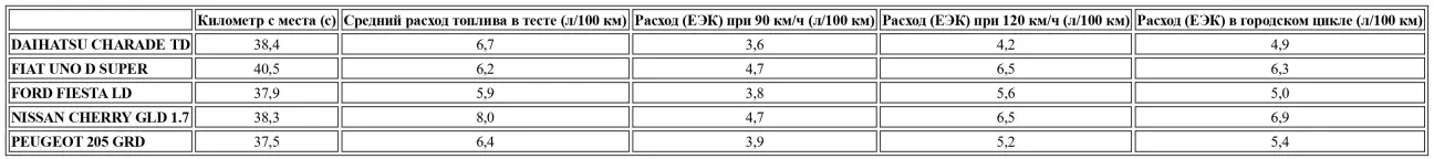 Мини–автомобиль — мини–расход! Действительно, Charade Turbo Diesel не очень прожорлива, хотя ее средний расход 6,7 л/100 км все же выше, чем у Ford Fiesta D (5,9 л) и Peugeot 205 D (6,4 л). Однако, японские мотористы проделали отличную работу, настолько, что эта версия требует меньше топлива, чем атмосферный двигатель, хотя он и менее мощный... Кривая расхода легко это доказывает: 4,6 л при 90 км/ч (3,6 л по заявлению завода) и 6,5 л при 120 км/ч (6,2 л). При более спортивном использовании (маленький двигатель это любит) форсунки требуют 9,1 л, тогда как при более спокойной езде можно легко обойтись 4,5 л. В городском движении компактные размеры и резвость двигателя творят чудеса. Это позволяет, быстро перемещаясь в потоке, сжигать всего 5,8 л. Отметим также, что на километровой дистанции с места этому двигателю достаточно 130 см³ дизельного топлива, что соответствует теоретическому расходу 13 л/100 км. Совсем неплохо! Что касается запаса хода, то 35–литровый бак позволяет проехать в среднем чуть более 500 километров.