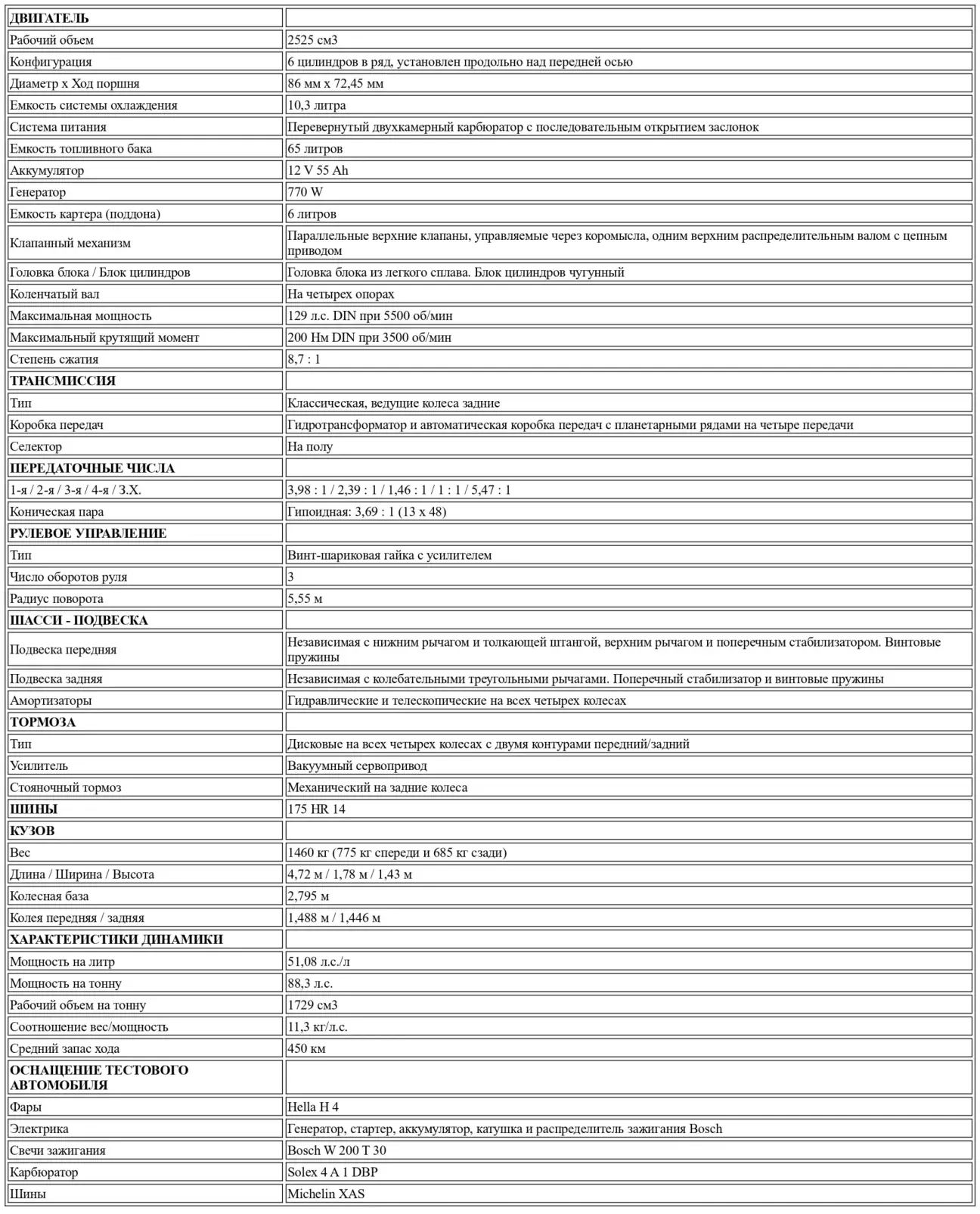 Имея точный рабочий объем 2525 см³, Mercedes 250 является самым маленьким из шестицилиндровых двигателей марки. Его ход поршня 72,5 мм очень короткий по сравнению с диаметром цилиндра 86 мм, но главное новшество заключается в коленчатом валу, который, в соответствии с новейшей тенденцией, опирается только на четыре опорных подшипника вместо семи, то есть у него больше нет подшипника между каждым из цилиндров. Газораспределение обеспечивается одним верхним распределительным валом, а питание осуществляется с помощью перевернутого двухкамерного карбюратора. При очень умеренной степени сжатия 8,7 достигается реальная мощность 129 л.с. DIN при 5500 об/мин. Другая особенность — планетарная автоматическая коробка передач имеет четыре, а не три передачи, причем первая передача очень короткая и используется только для резких стартов с места. Задний мост по–прежнему подвешен, и, конечно же, все четыре независимых колеса установлены на винтовых пружинах. Передняя подвеска новая, то есть она унифицирована с подвеской серии S; она обеспечивает высокую точность управления. Рулевое управление — редукторного типа, но с усилителем, что позволяет иметь очень острое передаточное отношение с тремя оборотами руля от упора до упора. Торможение осуществляется четырьмя дисками с мощным вакуумным усилителем. Не очень большие шины — 175 HR 14. Новая «маленькая машина» длиннее прежней на 4 см и шире на 1,5 см, но при этом она на 23 см короче и на 8 см уже, чем большие автомобили класса S. Со всеми заправленными жидкостями мы зафиксировали на весах значительный вес 1460 кг, из которых 775 кг приходится на переднюю часть. Для освещения, а также для внешней идентификации 250 получил только четыре круглые фары, две из которых противотуманные, как у Mercedes с четырьмя цилиндрами, хотя он должен был бы иметь прямоугольные фары, предназначенные для шестицилиндровых моделей.