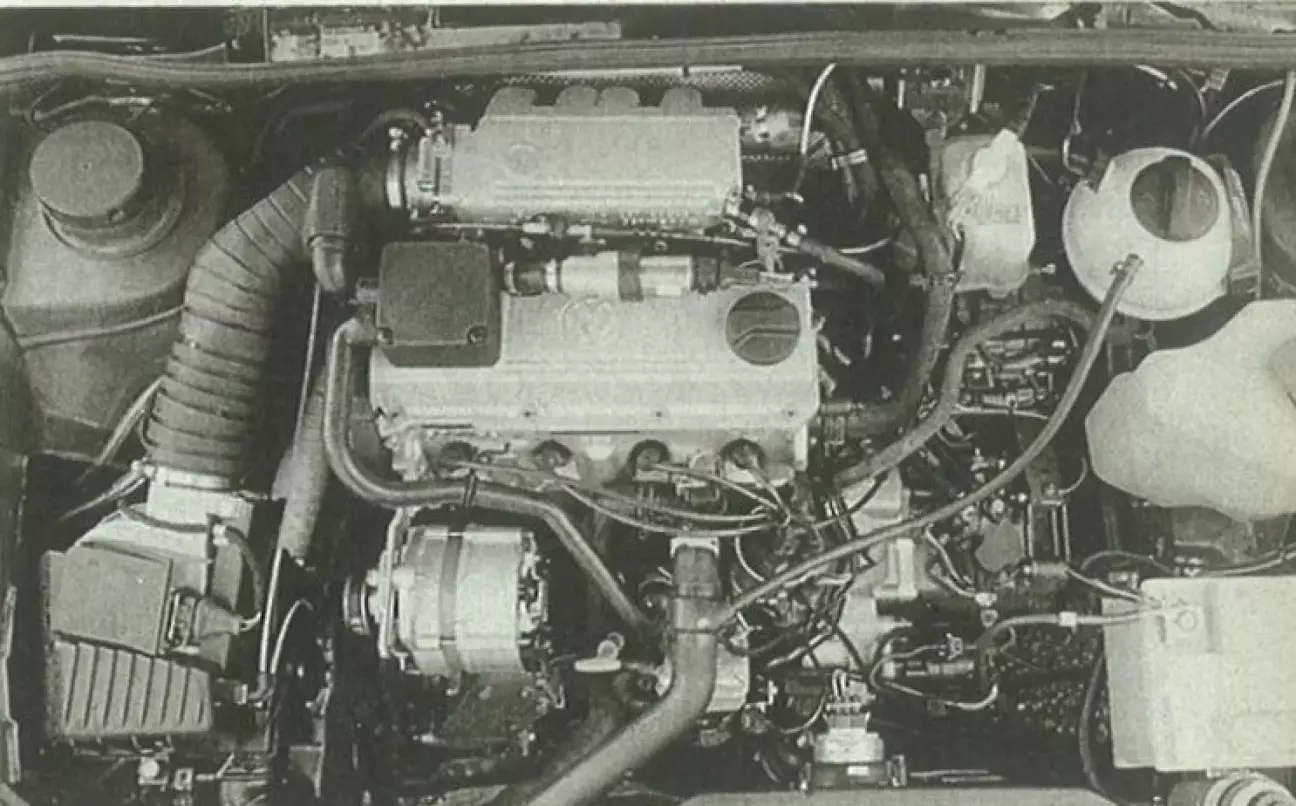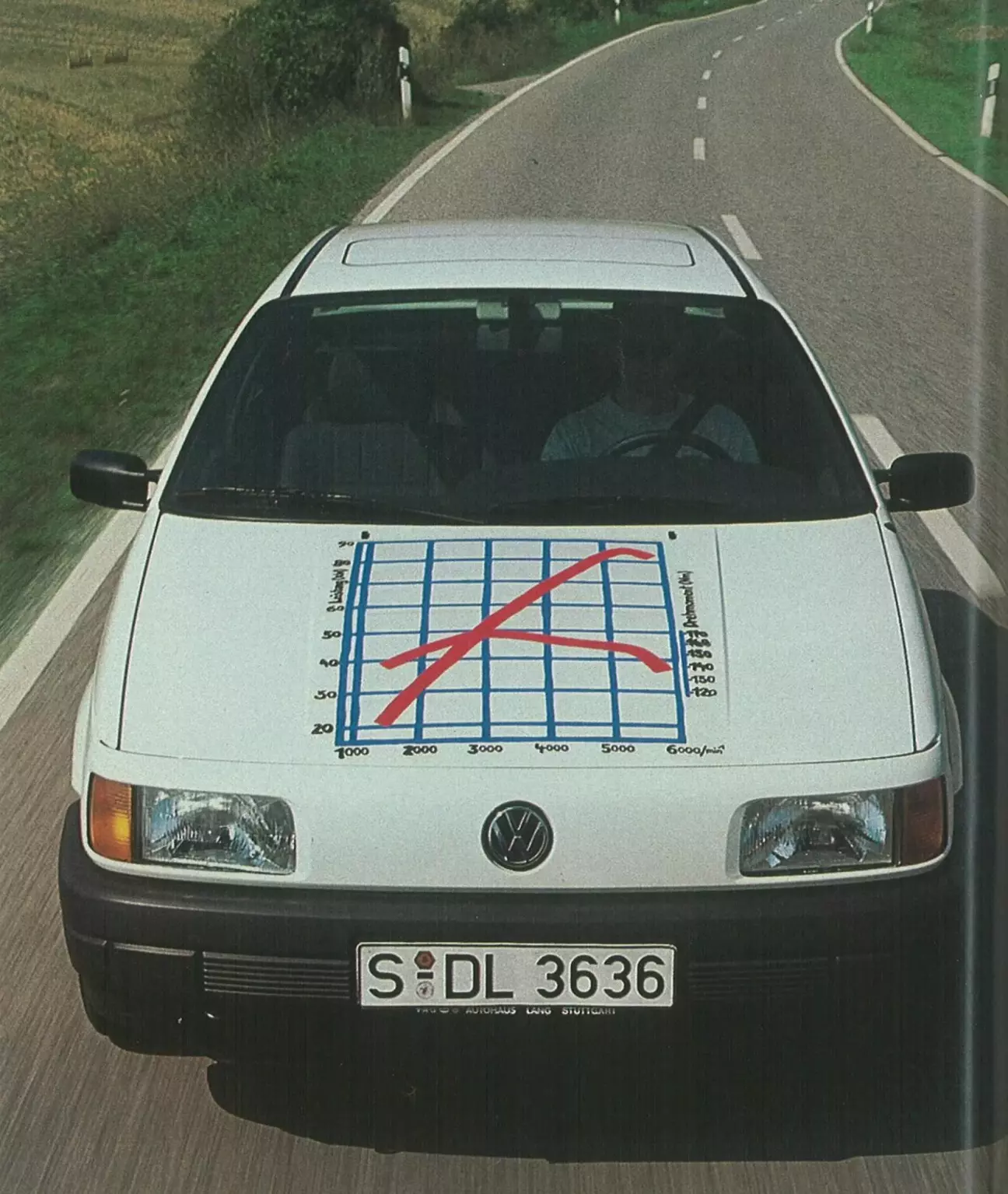 Остальные проверенные конструктивные особенности двигателя 827 остались неизменными. Так, распределительный вал по-прежнему расположен в головке блока и приводит клапаны напрямую через толкатели; впускные и выпускные каналы, как и раньше, находятся с одной стороны. Управление двигателем берет на себя полностью электронная система впрыска и зажигания Digifant. После пуска новый агрегат VW Passat сразу переходит на ровные низкие обороты холостого хода и охотно принимает газ даже в холодном состоянии. Процесс прогрева тестового автомобиля не омрачался ни рывками, ни раскачкой. Удивительно хорош подхват уже с 1500 оборотов. Езда в ленивом режиме быстро входит в привычку, а высокие обороты почти всегда остаются исключением. Впрочем, крутить мотор — не проблема. При разгоне на передачах стрелка тахометра легко уходит за отметку 6000/мин. Однако это дает лишь незначительный прирост динамики, зато существенно увеличивает уровень шума. Ведь длинные шатуны хоть и полезны, но скрыть типичный голос рядной четверки они не в силах. Нет сомнений: двигатели с балансирными валами в этом диапазоне работают еще мягче, но и потребляют они больше.